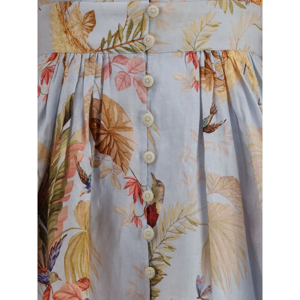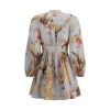 Zimmermann’s Ascension Plunge mini Dress by Zimmermann, made from lightweight linen, features a V-neck front that flatters the silhouette. The chemisier style is enhanced with a front button fastening and a back zipper closure for a practical and comfortable fit. Balloon sleeves with elasticized cuffs lend a romantic touch, while the multicolored floral pattern adds vibrancy and freshness. The flared skirt completes the design, creating a perfect balance between femininity and lightness.