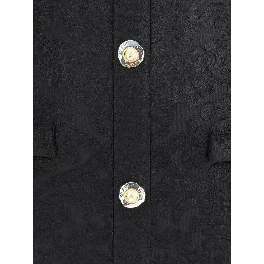 Balmain’s Baroque short Dress combines elegance and character in a refined design. Made of bouclé fabric with a rich baroque pattern, it features an American collar that enhances the silhouette and a back zipper closure. Gold embossed buttons on the front add an iconic and luxurious touch typical of Balmain style.