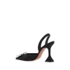 Begum Pumps by Amina Muaddi, elongated almond toe on front, geometric leather heel, slingback detail on heel, rhinestone and glitter jewel applied embossed on toe, press-on logo leather insole.