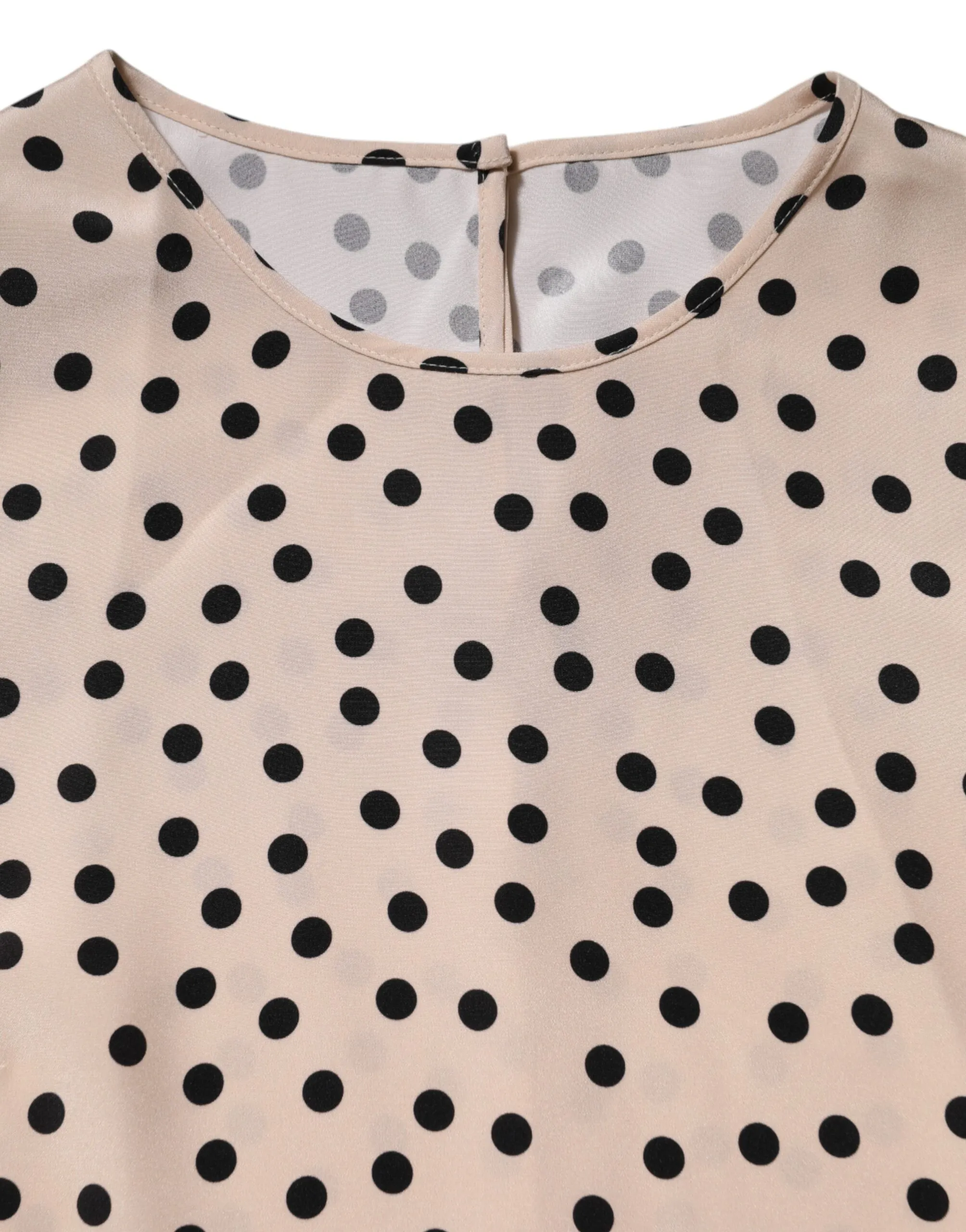 Gorgeous brand new, 100% Authentic Dolce & Gabbana silk blouse, designed with a playful black polka dot print on a refined beige background. Crafted in Italy from 100% luxurious silk, this blouse features short sleeves, a round neckline, and a back button closure for a feminine and sophisticated silhouette.
