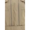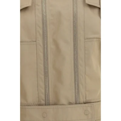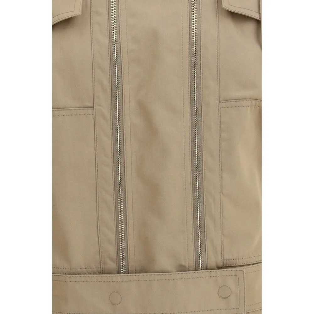 The cotton blouson Jacket by Fendi features a double front fastening with two full-length parallel metal zips and a front martingale for added structure. It is designed with a shirt-style collar, a removable drawstring hood, and low-set sleeves finished with cuff straps. The pockets include two buttoned patch pockets on the chest and side pockets. Crafted from beige cotton drill, the jacket is completed with a tone-on-tone collar and martingale, a leather undercollar, and an embroidered Fendi logo on the right chest pocket. The metal hardware comes in a palladium finish.