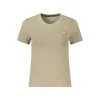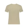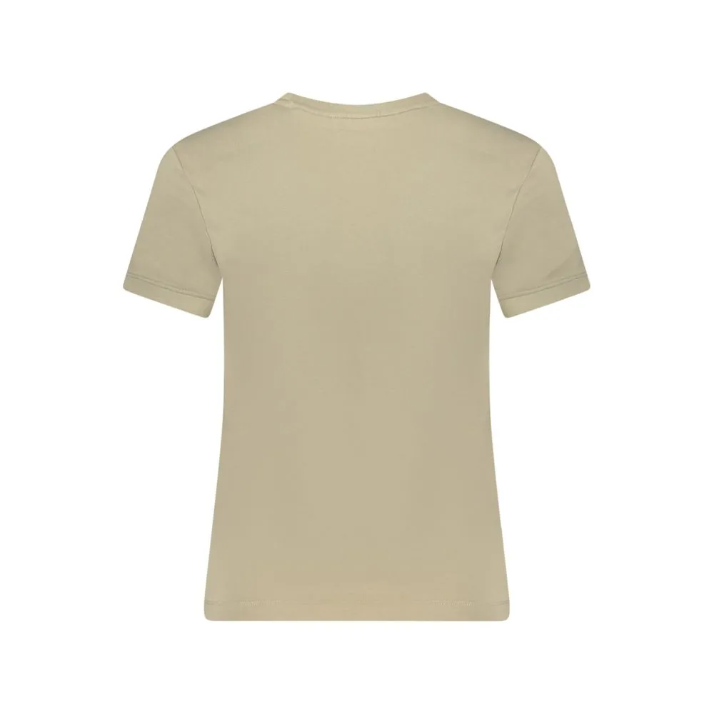 Elevate your wardrobe with the effortlessly chic Guess Jeans tee, a perfect blend of comfort and signature style. This beige t-shirt features a flattering wide neck and is adorned with a standout logo application, ensuring you shine in casual luxury. Crafted from a sumptuous mix of organic cotton and a hint of spandex, this piece offers both sustainability and a touch of stretch for an ideal fit. Embrace the bold and trendy spirit of Guess Jeans with this stylish staple.