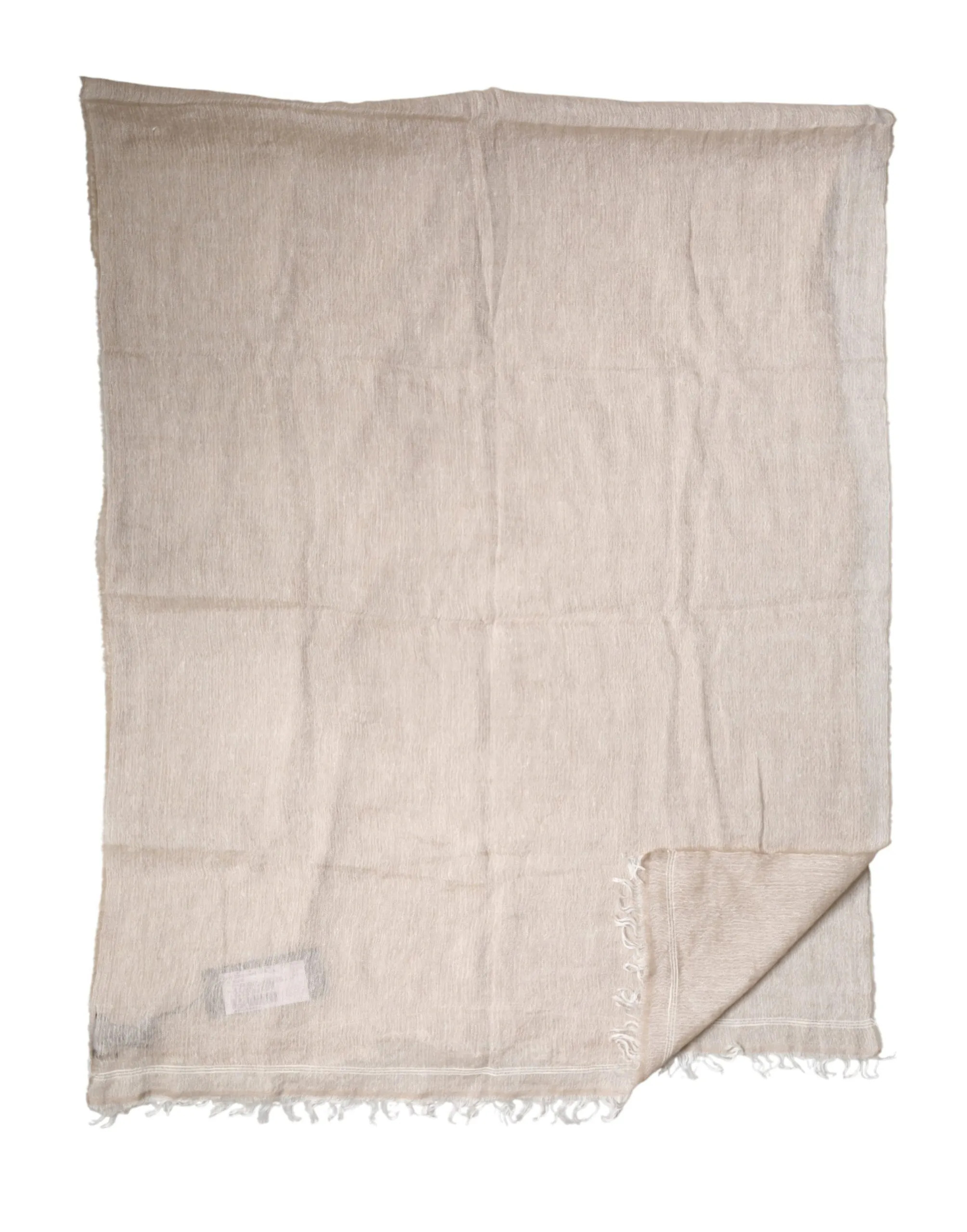 beige linen scarf, designed as a versatile men’s neck wrap and shawl. Lightweight and breathable, it offers a relaxed yet refined drape, perfect for warm-weather styling. Finished with subtle fringe detailing, it adds texture and sophistication to both casual and polished outfits.