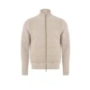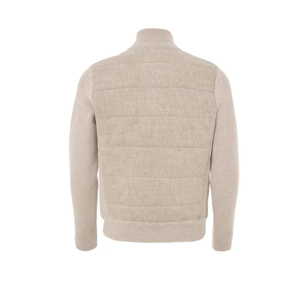 Beige bomber jacket in melange fabric and Gran Sasso wool. Front zip fastening, two side welt pockets with alcantara details. Ribbed wool sleeves and mock collar, with matching fabric trim on the sides. Padded and lined.