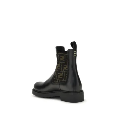 FF leather and fabric Ankle Boots by Fendi combine urban style with iconic details. Made of black leather with elastic side inserts, they feature fabric details with the unmistakable FF motif. The back is embellished with metallic Selleria stitching, while embossed Fendi lettering decorates the front. A rubber sole and heel with Fendi logo on the side complete the design.
