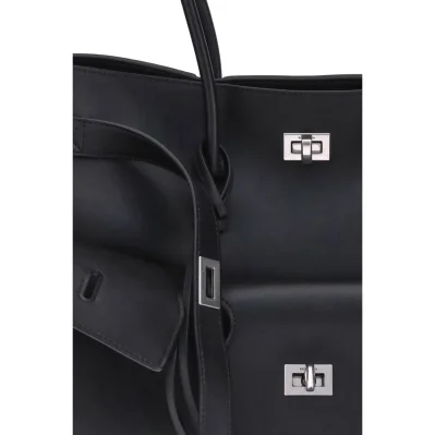 Balenciaga’s Bel Air medium Shoulder Bag is a spacious and functional accessory with a versatile pouch design. It features two handles for convenient carrying and the Balenciaga Paris logo embossed with silver lamination on the back, attesting to its authenticity. Enhanced with silver hardware and a removable key ring with double spiral loop, this bag is designed for organization: it includes snap buttons on the sides to modulate the shape, a swivel closure, and belts on the front with engraved logo. The interior features a large front pocket, an open main compartment, two interior zippered pockets and two interior flat pockets, offering practical solutions for every need.