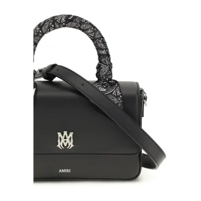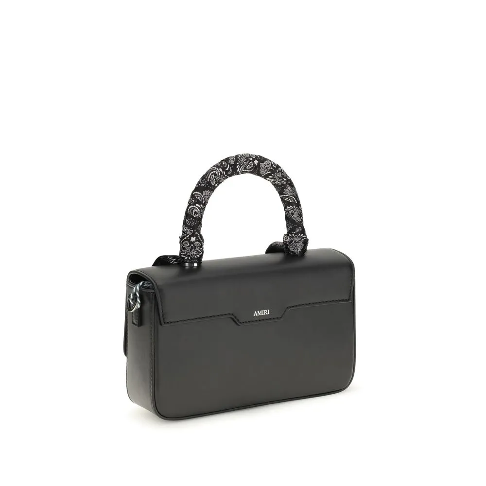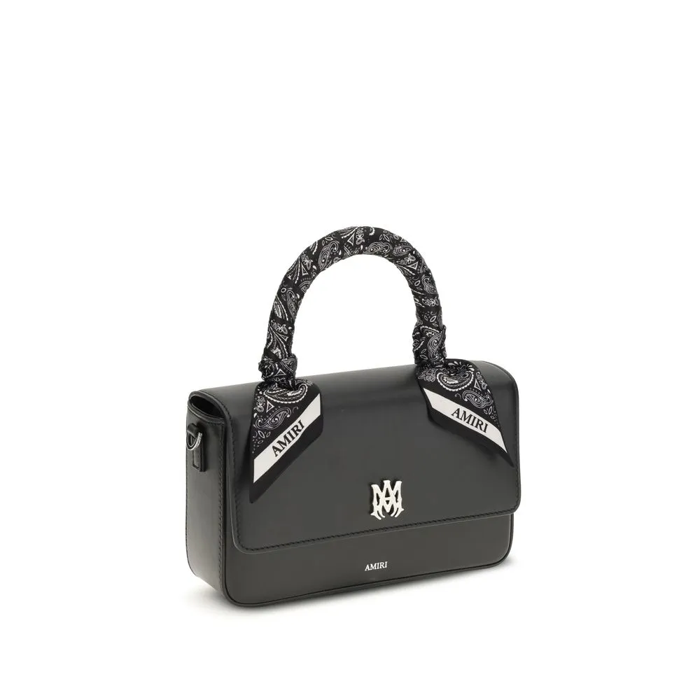 The Micro Long MA Handbag by Amiri is a sleek buffed leather top-handle bag featuring the brand’s signature refined details. The handle is wrapped with a bandana, and the adjustable, detachable crossbody strap allows versatile wear. Logo hardware and logo stamps appear on the face, along with a concealed front patch pocket. The magnetic flap closure opens to an interior equipped with a zip pocket, combining functionality with unmistakable Amiri style.