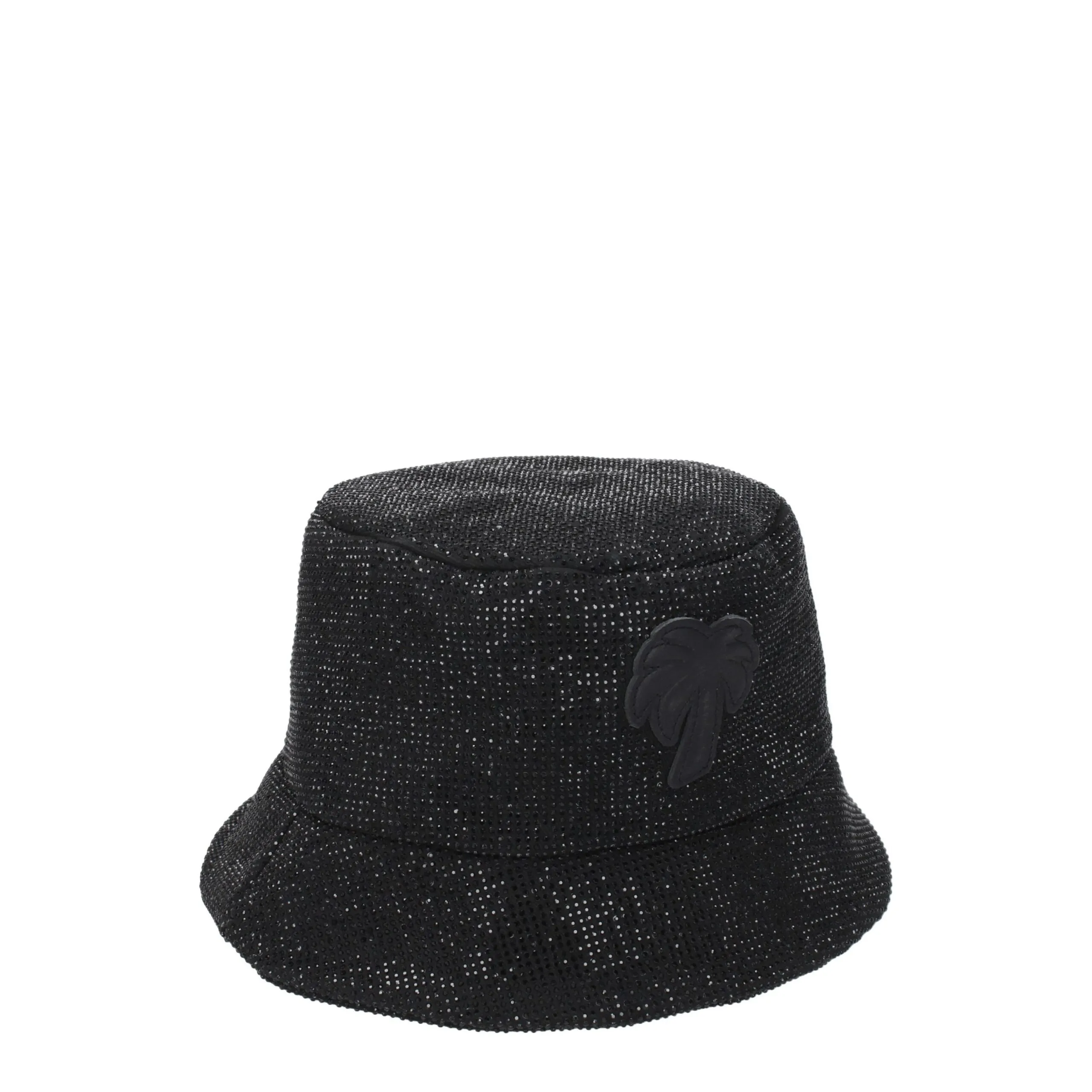 The product with MPN PWLA027FAB0011010 and code F76269 cotton in black is a hats designed by Palm Angels. It has features like front detail, side logo, rhinestone.