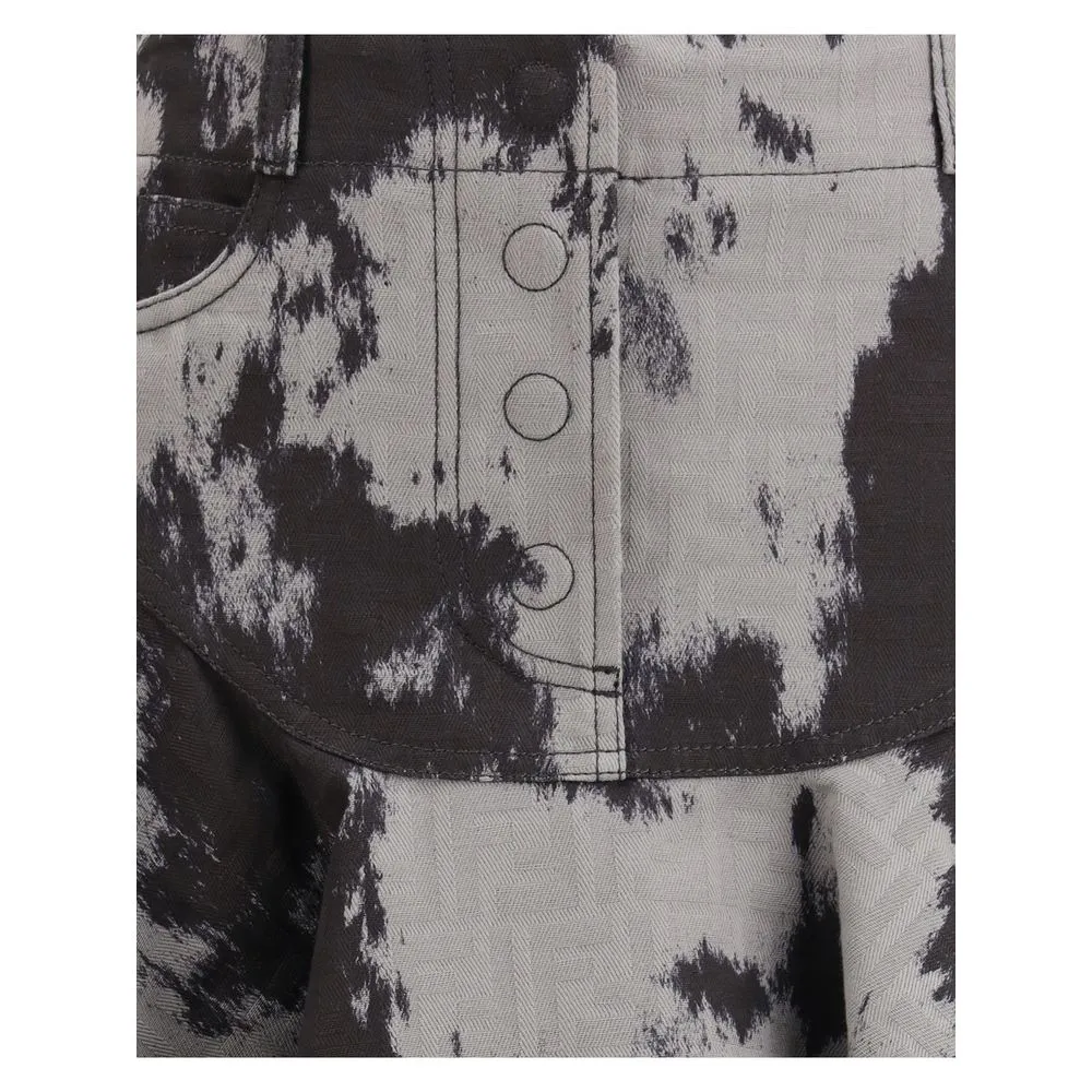 The Denim Miniskirt by Fendi features a high-waisted flared line that enhances the silhouette with balanced, natural elegance. Made from jacquard denim, it combines a structured construction with a soft texture that reinterprets the Maison’s artisanal heritage in a contemporary key. The archive-inspired pattern and refined details, such as the front button closure and leather label on the back, lend the piece a distinctive and sophisticated character.