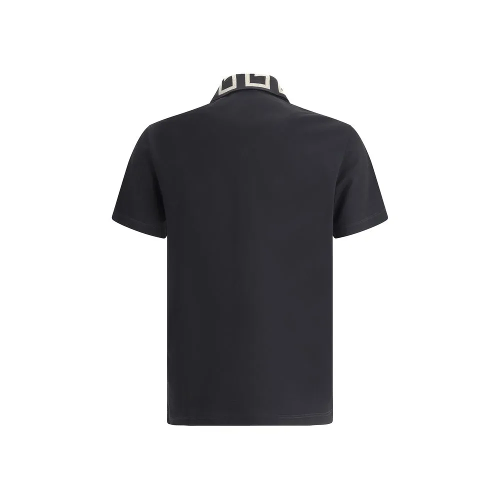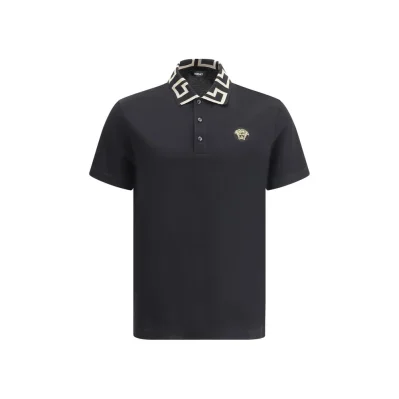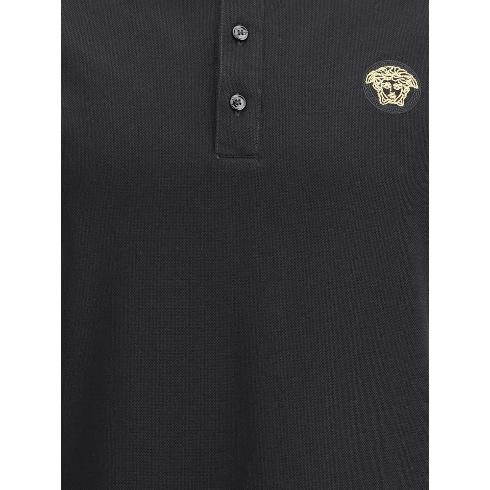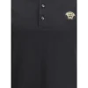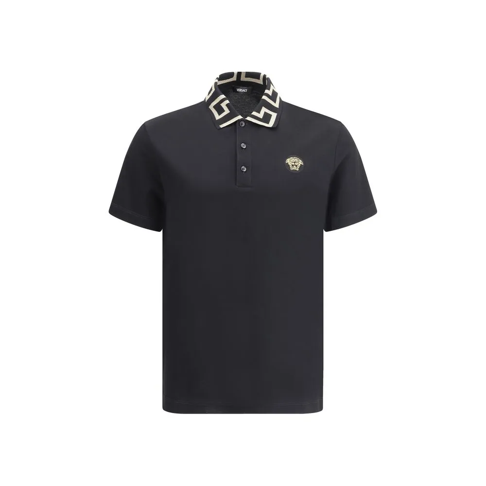 Cotton Polo Shirt by Versace, button front closure, classic ribbed collar with iconic brand motif detail, iconic Medusa logo patch applied to front, monochrome pattern, regular fit.
