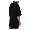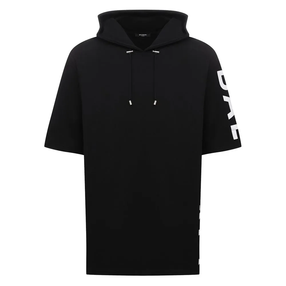 Discover the epitome of urban chic with the Balmain black cotton sweatshirt, tailored for the fashion-forward. This half-sleeve wonder boasts the iconic logo print that cascades with elegance down the side, offering a signature touch to your wardrobe. Featuring a practical drawstring hood, it’s a perfect blend of comfort and luxe style. Exude confidence in this must-have piece from Balmain’s refined collection.