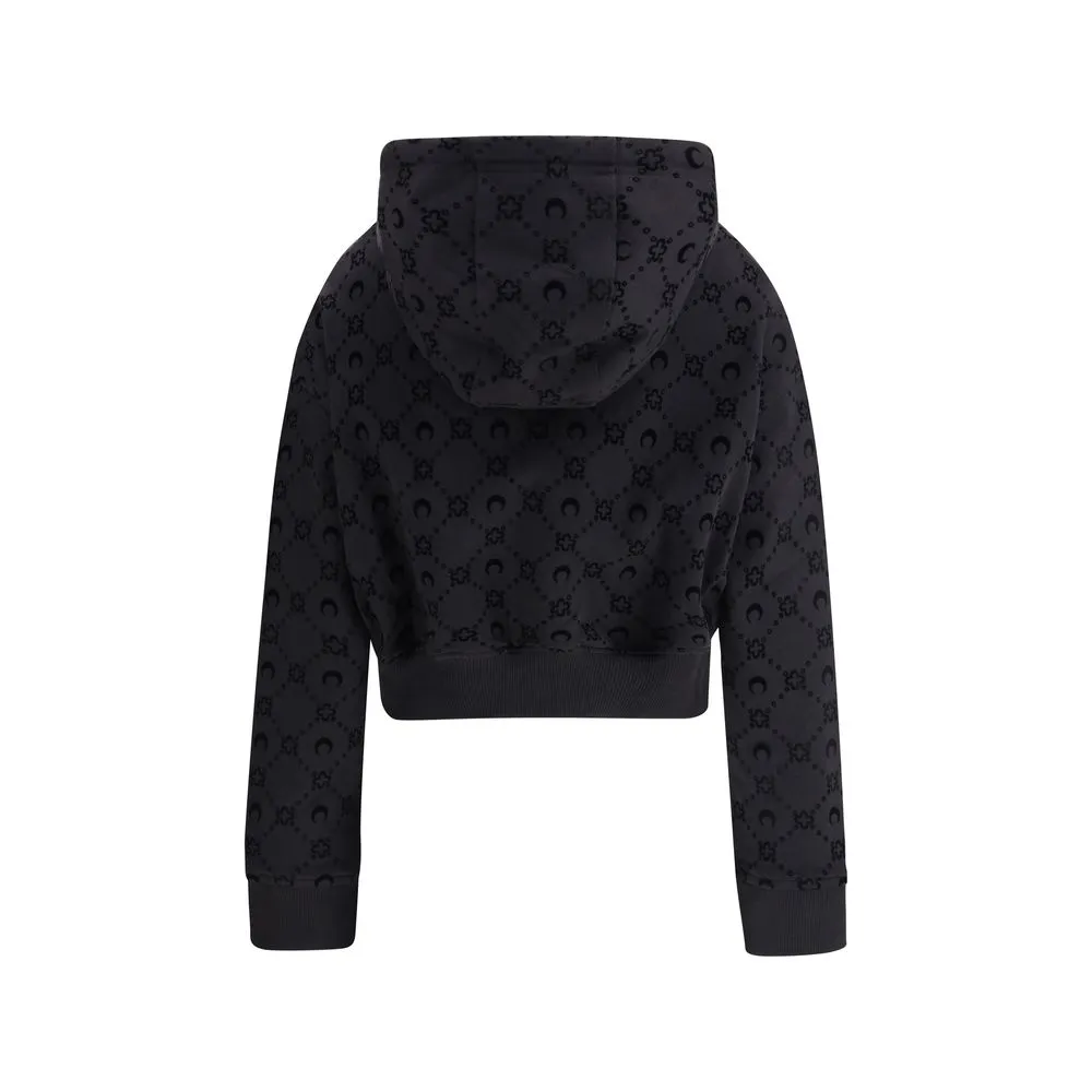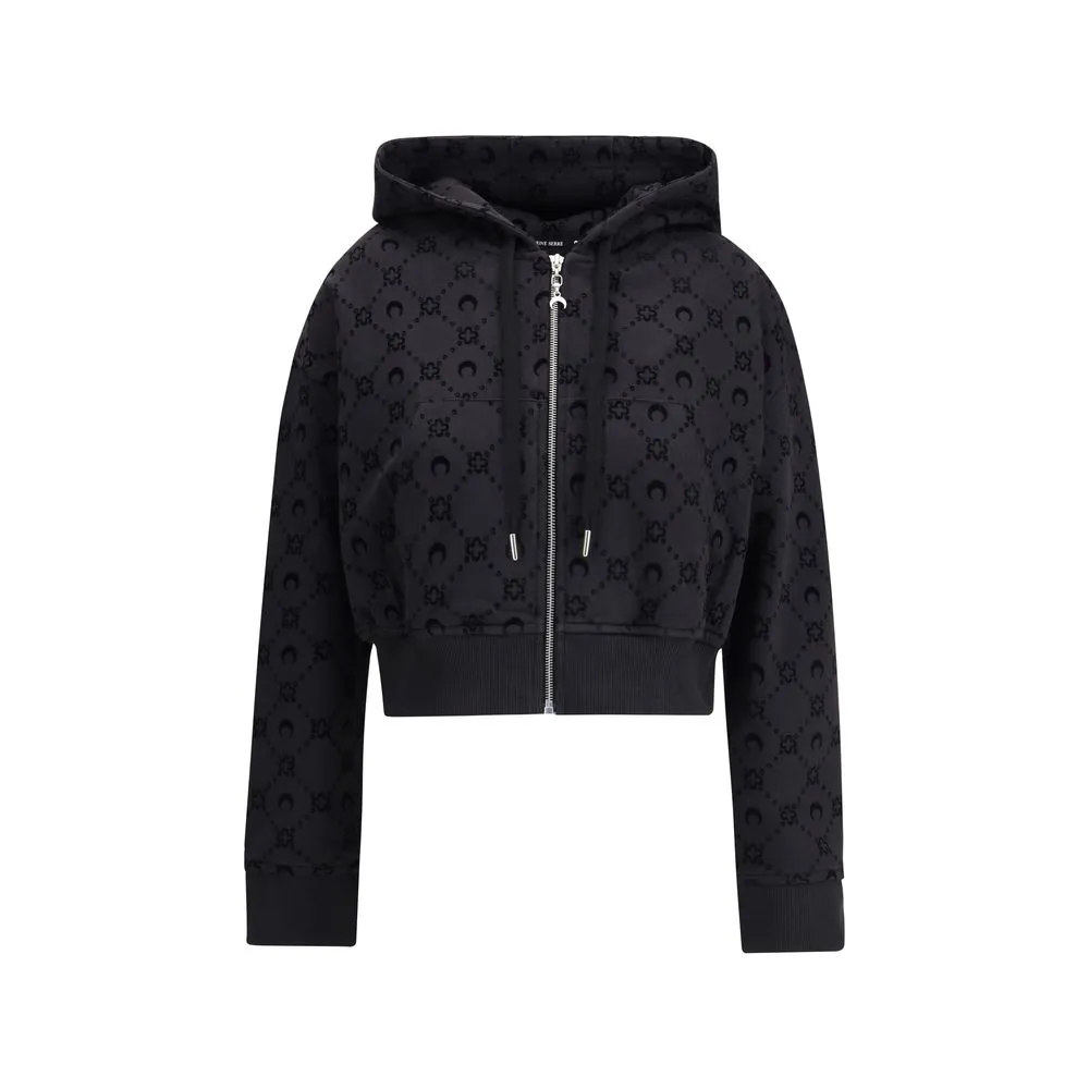 The Moonogram zipped Hoodie by Marine Serre combines comfort and signature style in a refined, modern design. Crafted from soft fleece, it features a cropped silhouette with a front zipper enhanced by the iconic crescent moon puller. The three-paneled hood and metal-tipped drawstrings add both functional and elegant details, while the kangaroo pockets and ribbed trims ensure a perfect fit. The flocked Moonogram pattern completes the piece with a distinctive touch, making it ideal for contemporary looks with a sporty yet sophisticated edge.