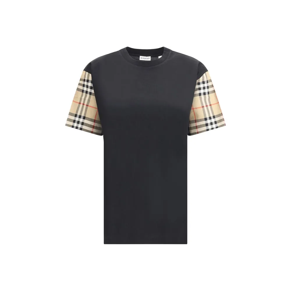 Burberry’s Cotton Check Archive Sleeve T-shirt is a garment that combines comfort with distinctive style. Featuring a ribbed collar, this T-shirt features sleeves embellished with the iconic Archivio Check pattern, one of the brand’s historic motifs. The simple, clean design of the T-shirt body highlights the sleeves with the famous pattern, creating a stylish and recognizable contrast.