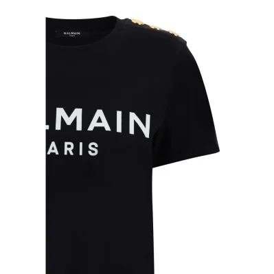 Balmain’s cotton T-Shirt combines the minimalism of a monochrome pattern with the elegance of the Maison’s iconic details. Made of soft cotton, it features a ribbed crew neck and a regular fit designed for everyday comfort. The design is enriched by the iconic Balmain monogram printed in contrast on the front and the unmistakable embossed buttons applied on the left shoulder, the brand’s distinctive signature. An essential and sophisticated garment, perfect for adding a touch of luxury to casual looks.