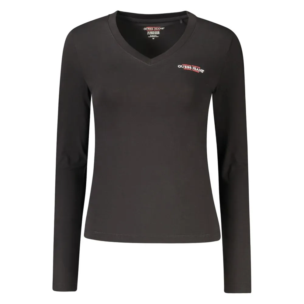 Elevate your wardrobe with the sleek sophistication of Guess Jeans. This long-sleeved t-shirt exudes confidence with its slim fit and alluring V-neck design. Made for the fashion-forward, the shirt boasts a statement-making print and the iconic Guess logo that promises to turn heads. Crafted from a blend of organic cotton and spandex, it offers both comfort and a flattering silhouette. Radiate boldness with this chic black top, a versatile piece for any trendsetter’s collection.
