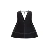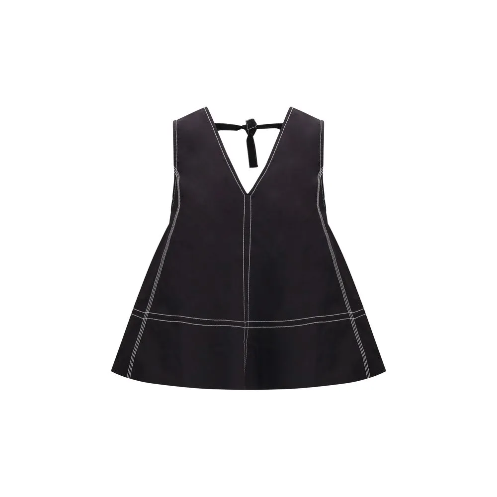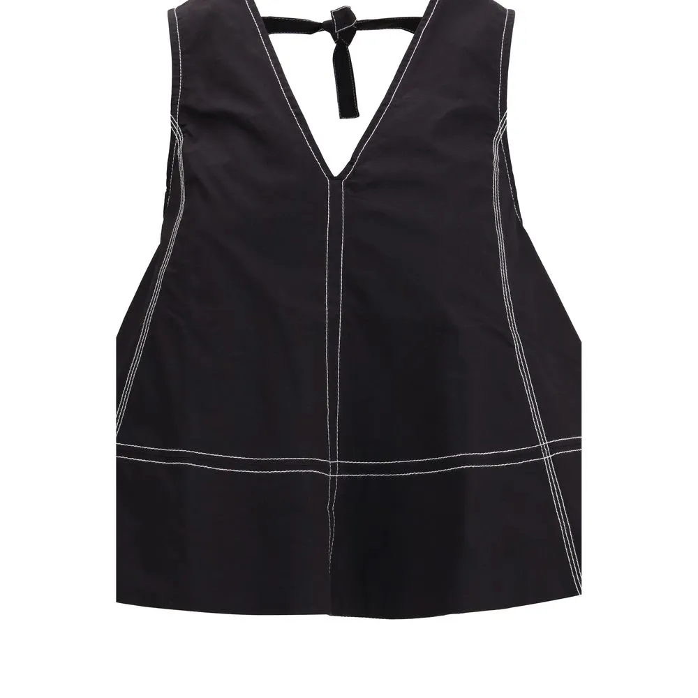 The Cotton A-line Top By Ganni elevates simplicity through a refined play of lines and structure. The V-neckline introduces a clean, effortless elegance, enhanced by contrast stitching that outlines the silhouette with graphic precision. At the back, the lowered opening is finished with a tied detail that brings softness and modern femininity. A piece that turns understatement into presence.