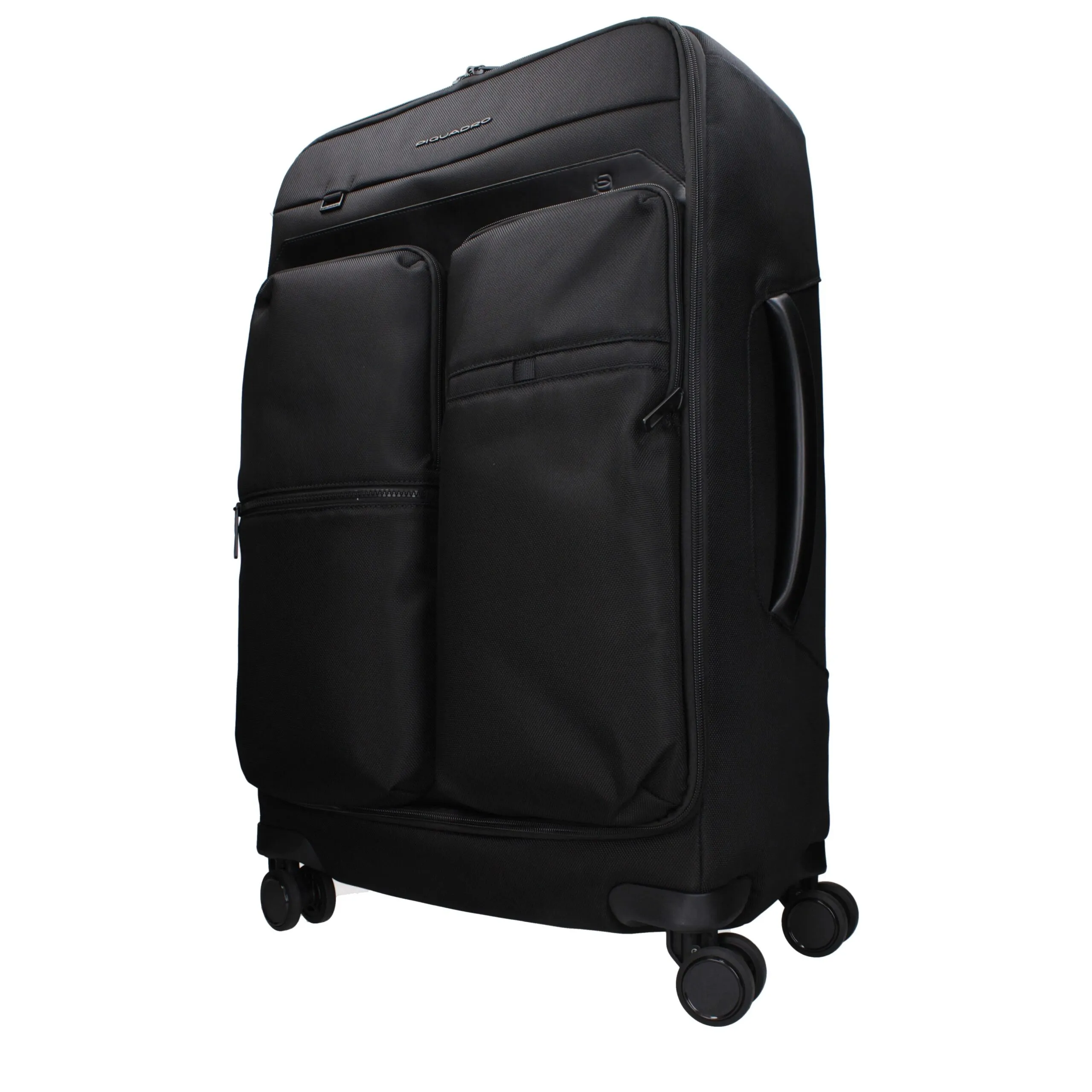 The product with MPN BV4733X19N and code F83832 fabric in black is a trolley designed by Piquadro. It has features like front logo, removable details, adjustable handle.