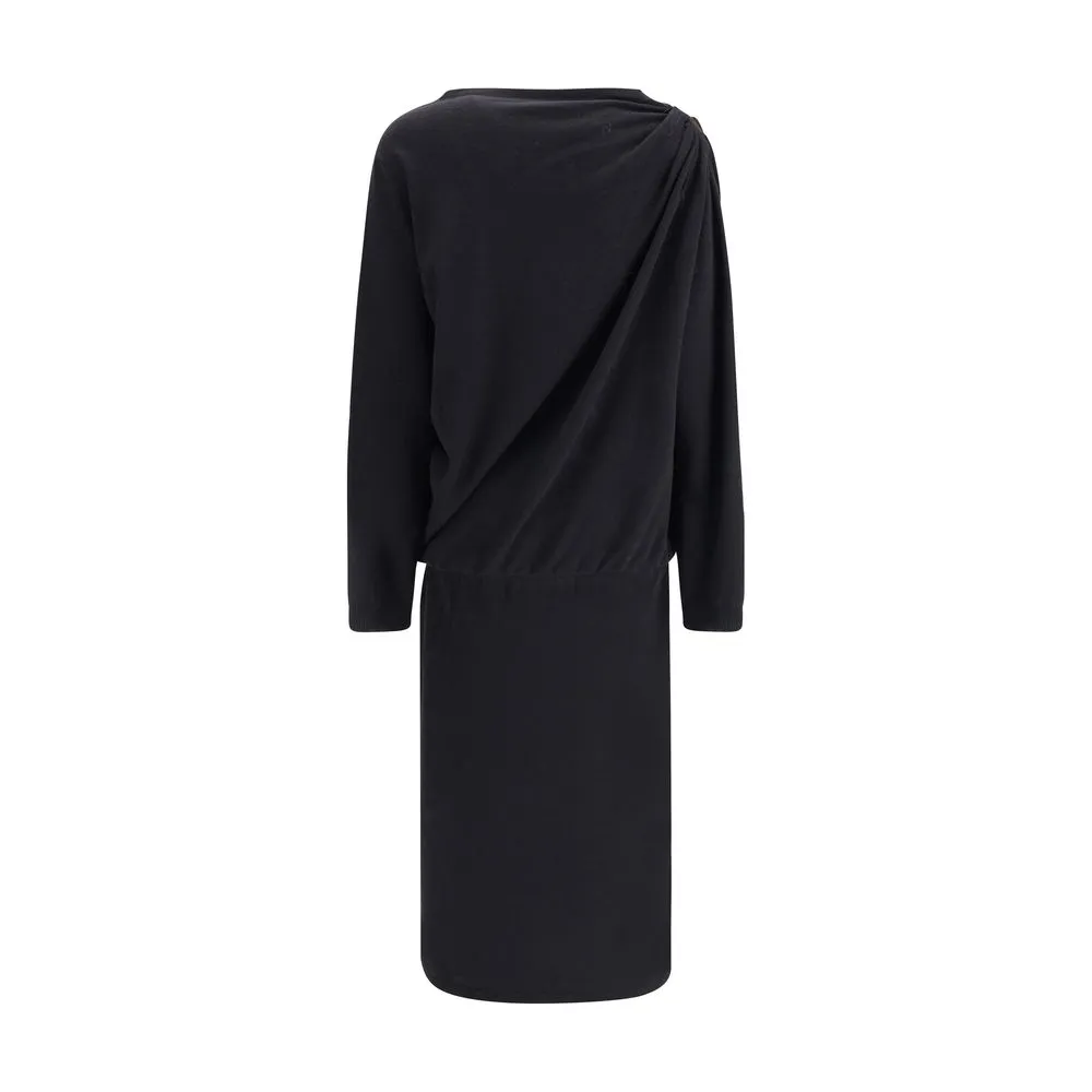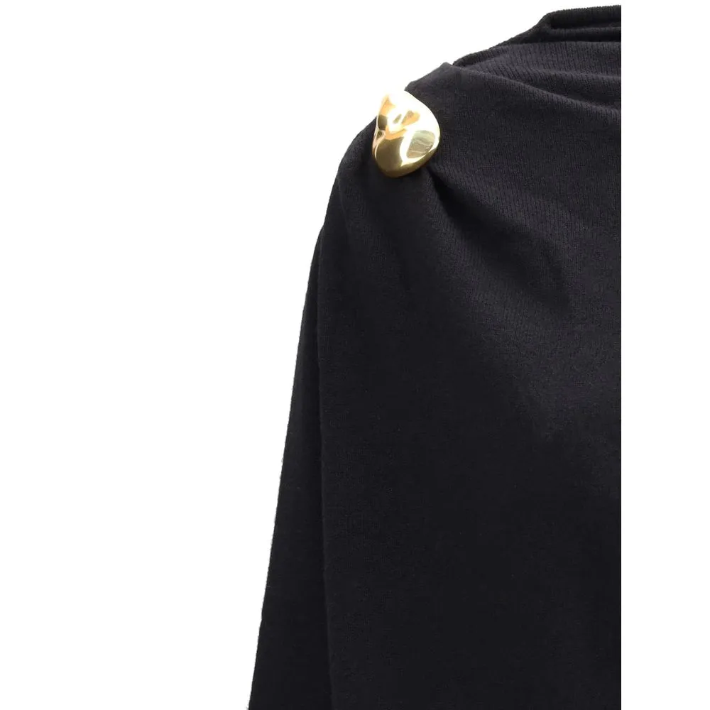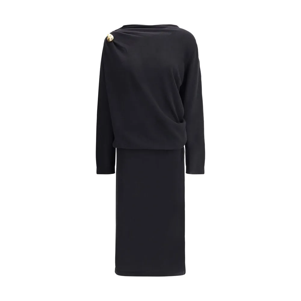Wool long Dress by Fabiana Filippi is a garment that combines elegance and understatement with impeccable attention to detail. Its clean line is enhanced by a discreet but striking gold button on the right shoulder, which adds a refined accent. The slightly marked waist draws a feminine silhouette without sacrificing comfort, while the ribbed cuffs lend a contemporary and functional note. Ideal for the cold seasons, this is a dress designed for those seeking style and quality in one.