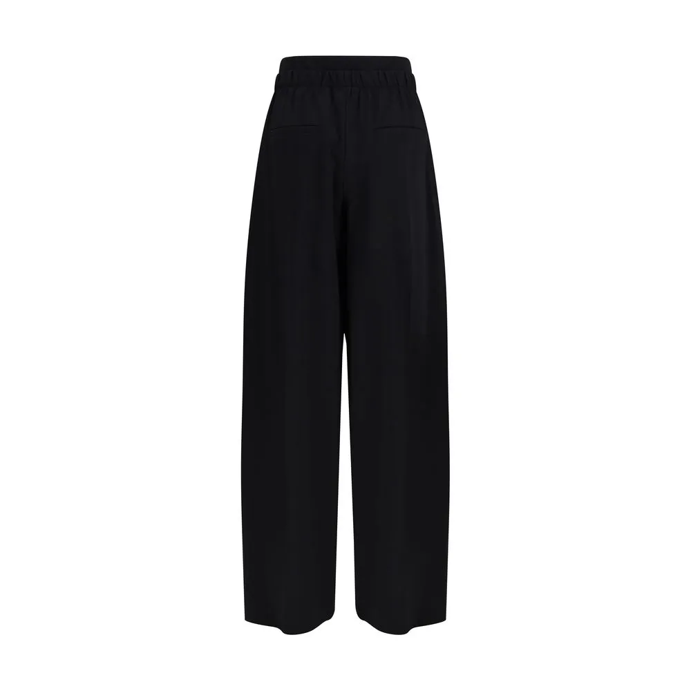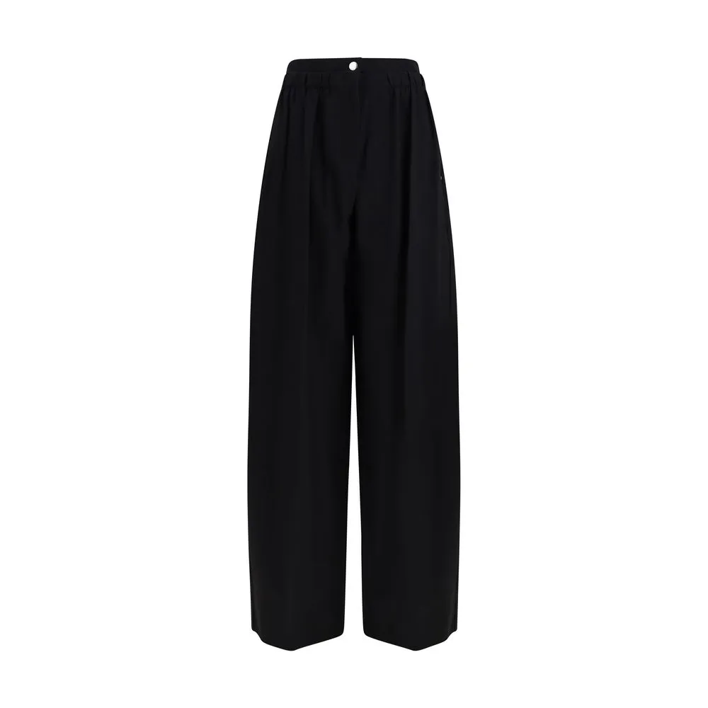 The Wide Stretch Wool Trousers by Sportmax are crafted from stretch gabardine and feature a fluid silhouette with a slightly low waist and a regular fit. The wide leg is defined by front and back pressed creases, while the double gathered waistband introduces a dynamic element that adds movement and a subtle sporty touch. Finished with a branded snap button and concealed zip, this design embodies the brand’s ability to blend tailoring and comfort within a clean, contemporary aesthetic.
