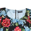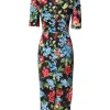 midi sheath dress features a vivid floral print set against a classic black background. Tailored for a flattering fit, it embodies feminine sophistication and timeless Italian style—perfect for both daytime elegance and evening allure.