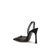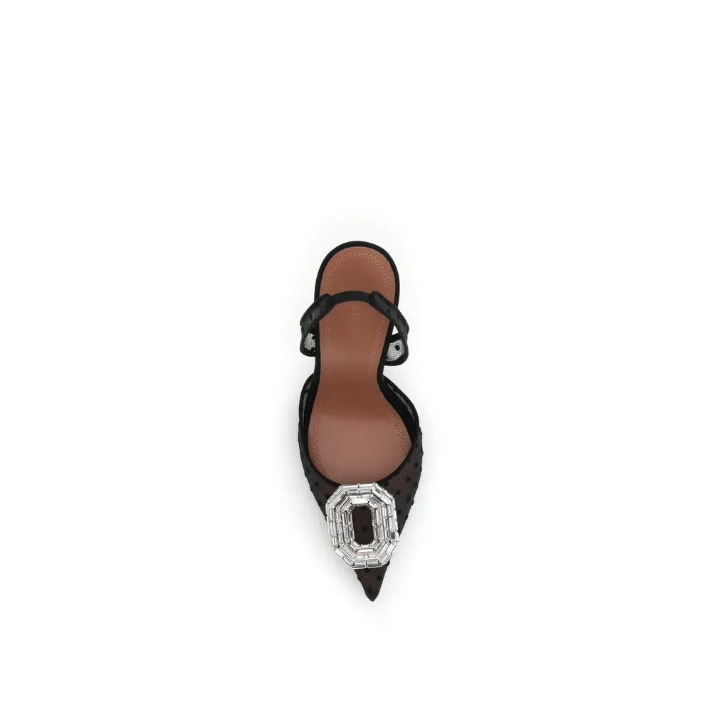 The Camelia Sling 105 Pumps in Polka-Dot Lace by Amina Muaddi embody refined femininity and contemporary allure. Crafted from black polka-dot satin, these pumps feature a pointed toe adorned with a rectangular mirrored embellishment for a touch of glamour. The slingback strap ensures a graceful fit, while the brand’s signature 105mm sculptural heel adds a modern, elevated finish — perfect for evening elegance.