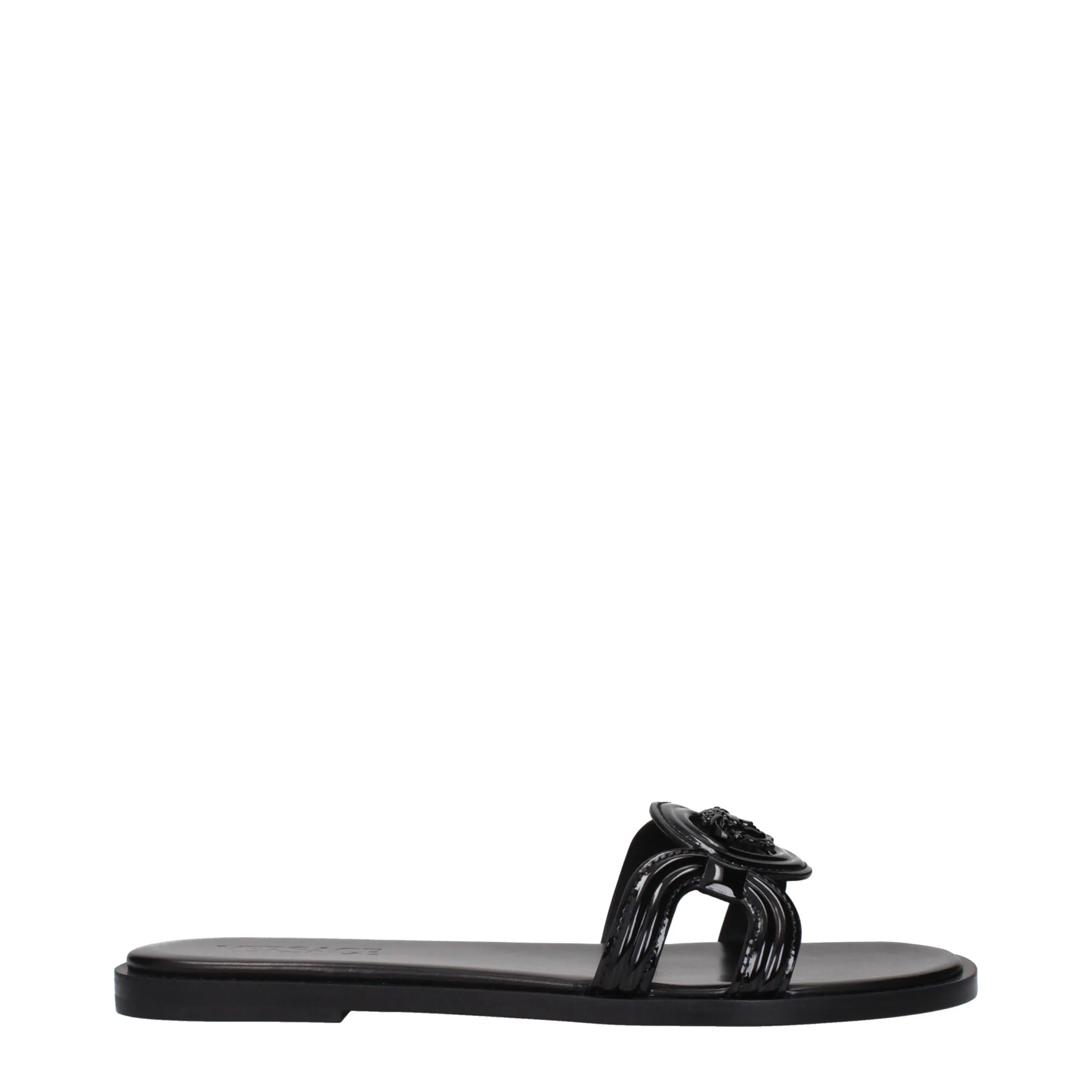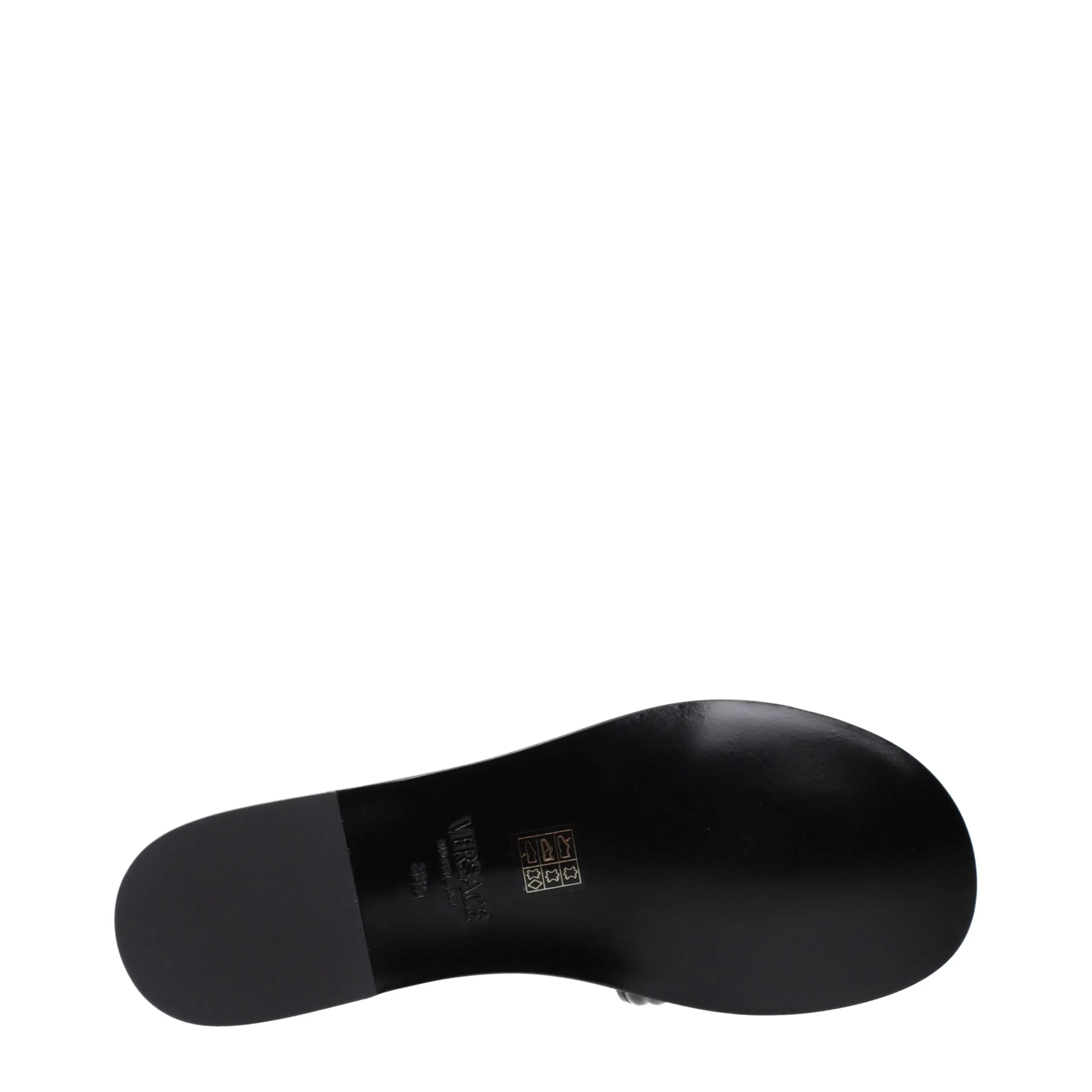 The product with MPN 1018364D2VE1B000 and code F84877 patent leather in black is a slippers and clogs designed by Versace. It has features like front logo.