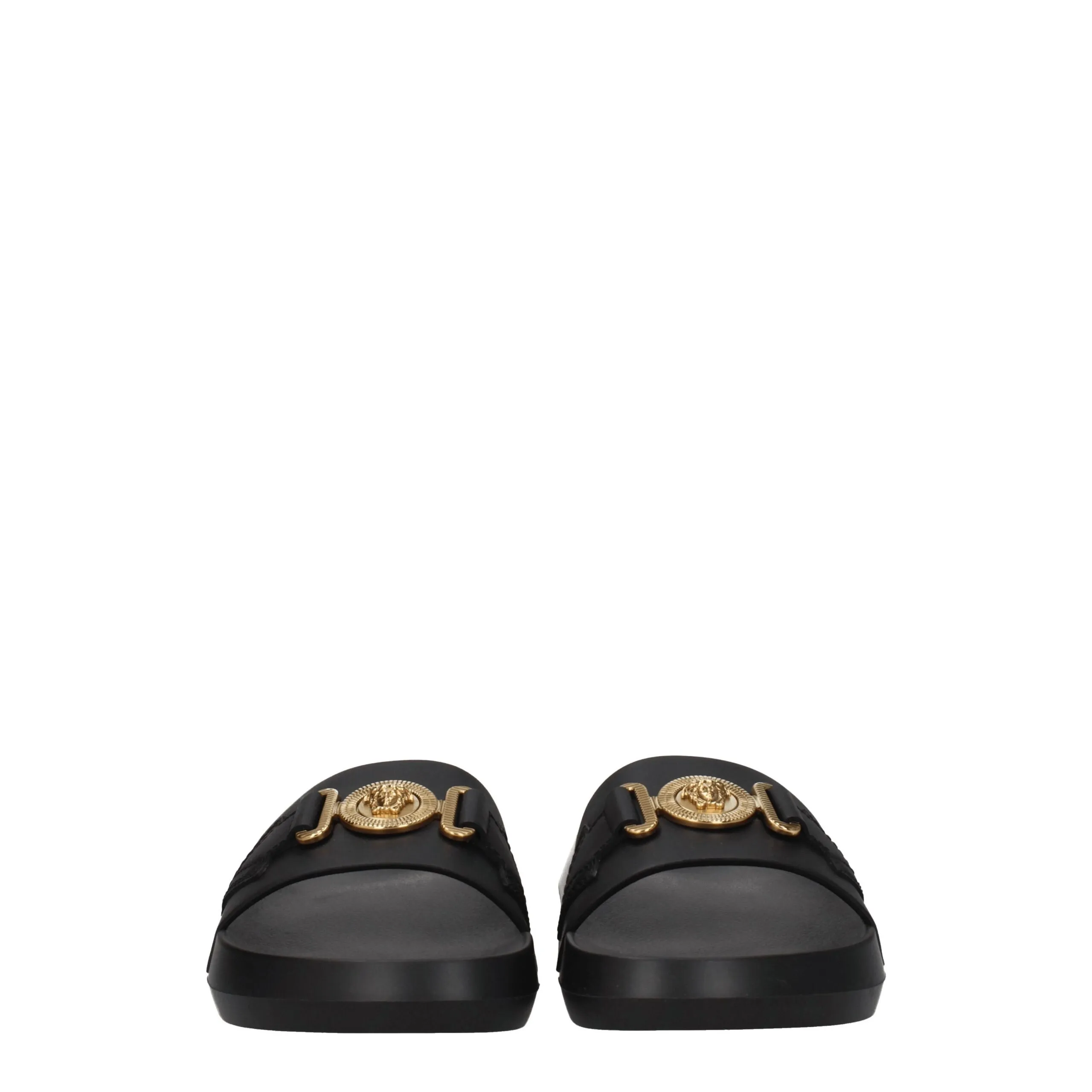 The product with MPN 1011304DV46G1B00V and code F78143 leather in black is a slippers and clogs designed by Versace. It has features like front detail, back logo.