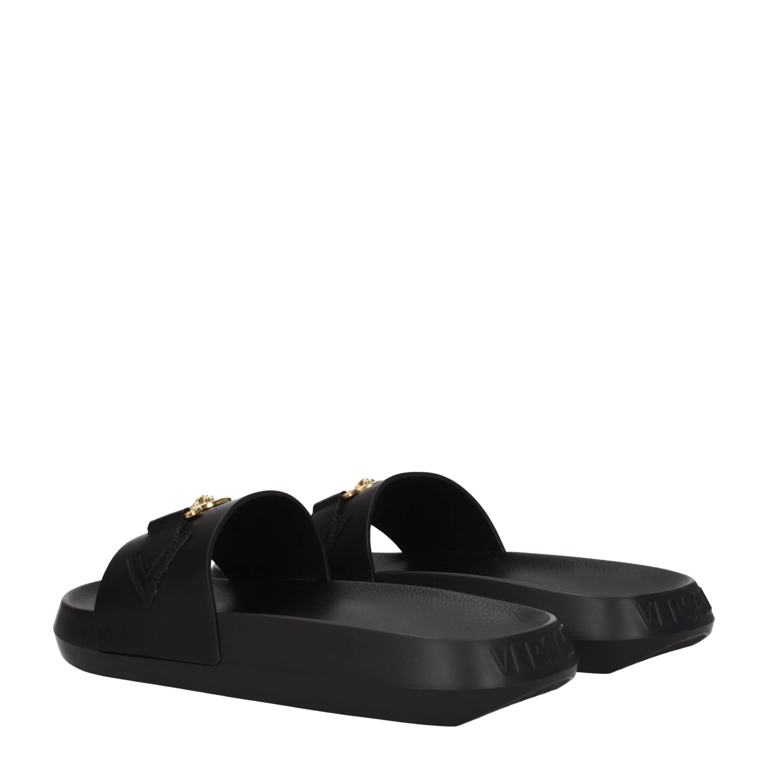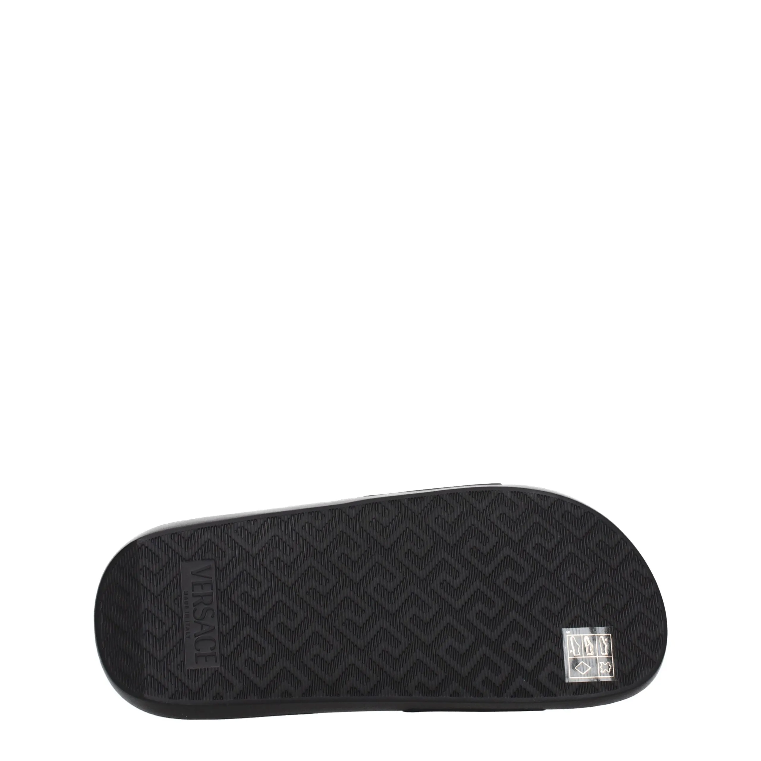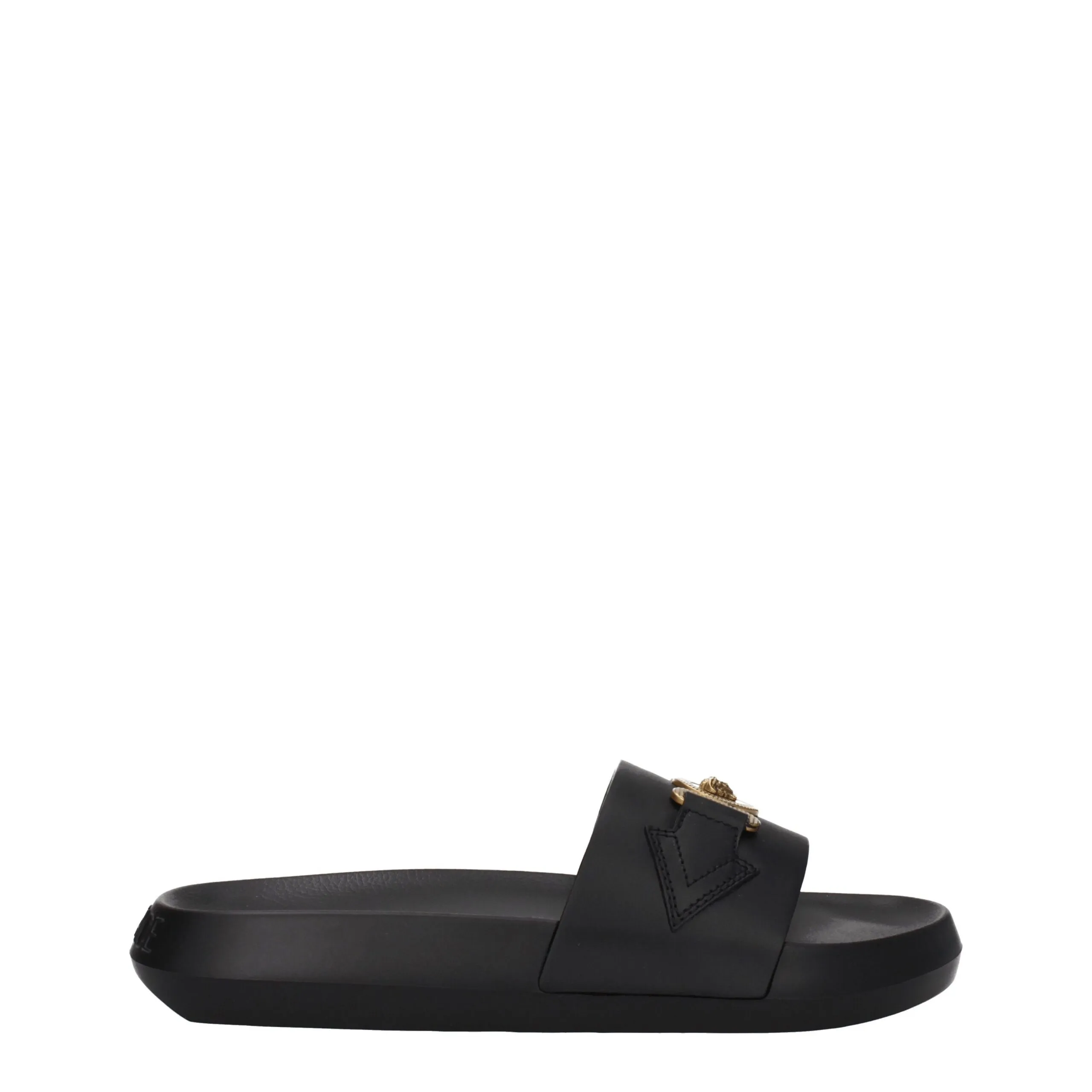 The product with MPN 1010628DV46G1B00V and code F78140 leather in black is a slippers and clogs designed by Versace. It has features like back logo.