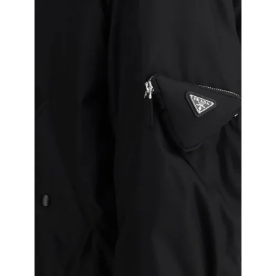 The Prada Re-Nylon Bomber redefines a timeless silhouette with the house’s innovative sustainable fabric. Featuring a front zip closure, long sleeves with a classic utility-style zip pocket, and two side flap pockets, it combines function and refined modernity. The straight hem ensures a clean fit, while the iconic enameled metal triangle logo plaque signs the piece with unmistakable Prada identity.