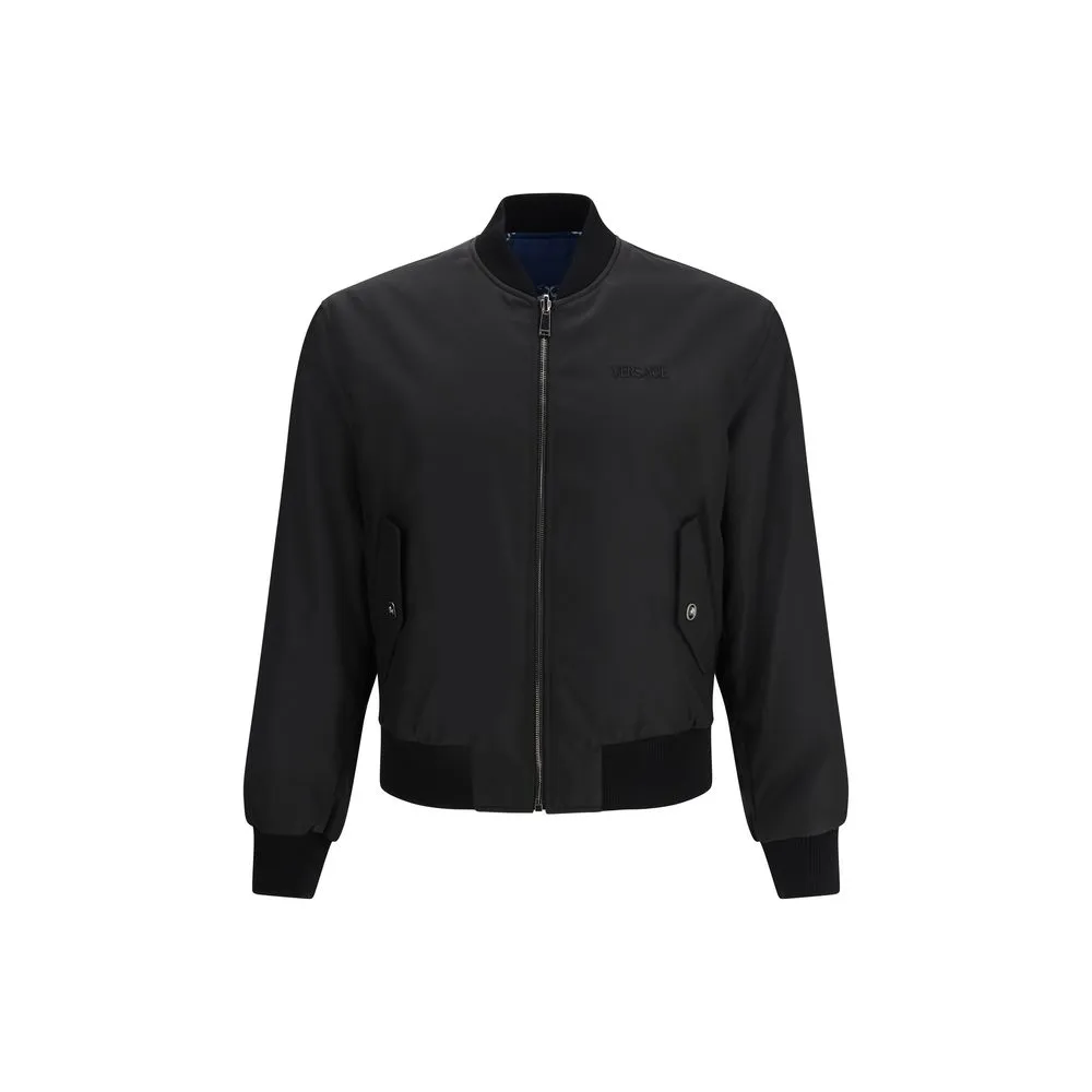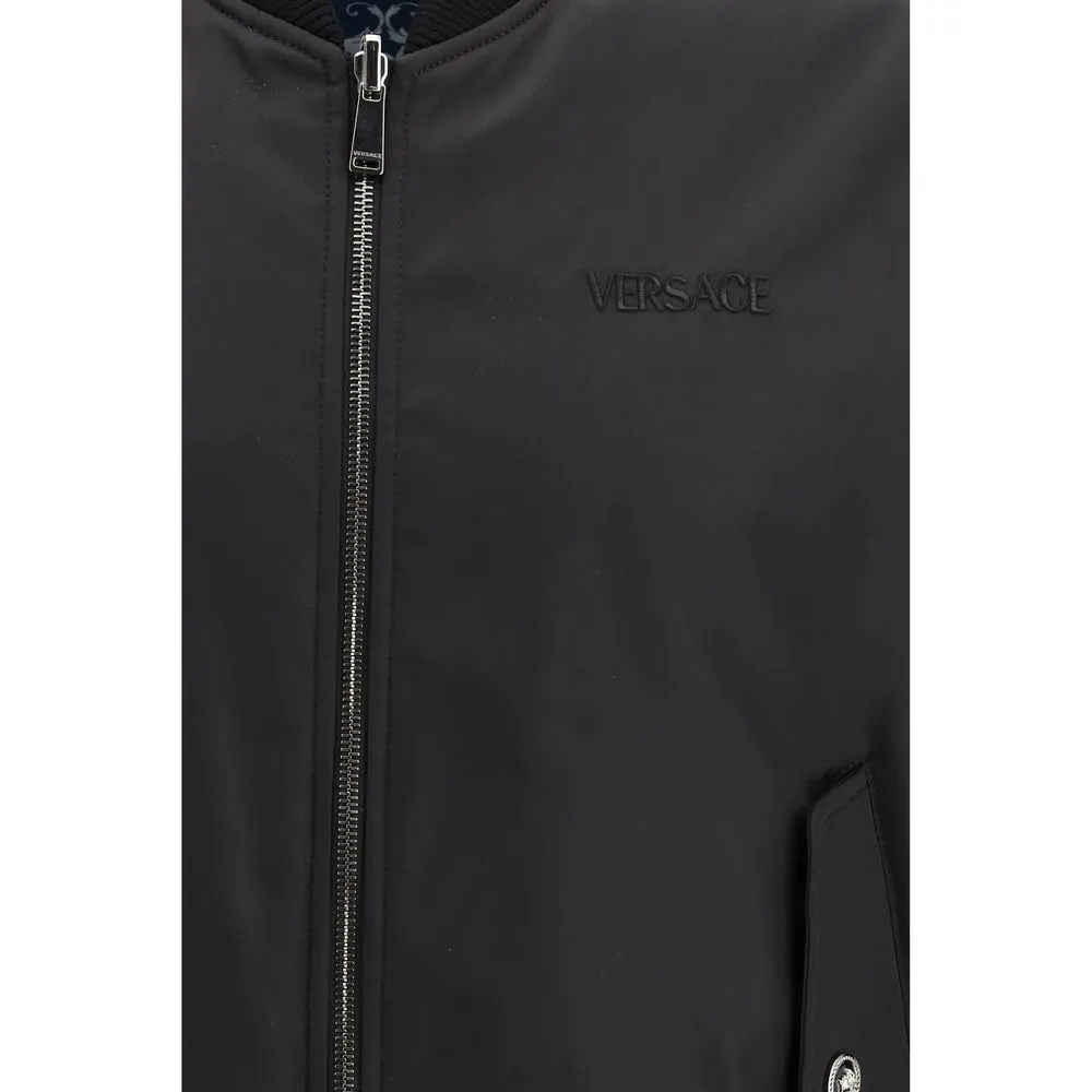 The reversible Blouson by Versace is a versatile piece with a bold presence. It features two front pockets with single-button closures arranged diagonally, and an embroidered logo positioned on the left chest for a signature touch. The jacket closes with a full front zipper, while ribbed cuffs and hem provide structure and a refined finish. A design crafted for dynamic, contemporary elegance.