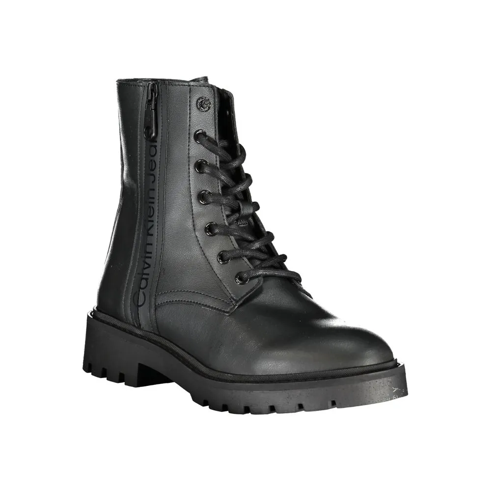Elevate your style quotient with these striking Calvin Klein ankle boots, a perfect blend of sophistication and modern edge. Designed to turn heads, they boast lace-up fronts complemented by convenient side zips for ease of wear. The iconic logo print asserts your penchant for renowned luxury, while the black hue ensures a versatile addition to your shoe collection.