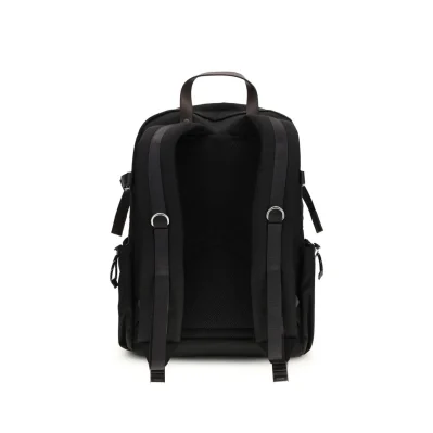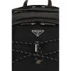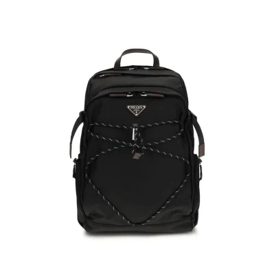 The Re-Nylon and leather Speedrock Backpack by Prada combines technical functionality and urban design. Featuring an adjustable technical drawstring, flat leather handle and adjustable fabric shoulder straps, it ensures comfort and practicality. The triangular enameled metal logo on the front adds iconic detail, while the zippered closure ensures maximum protection.The exterior is organized with three zippered pockets and a drawstring bottle pocket, while the padded mesh back offers breathability. The interior features a zippered pocket and a patch pocket, complemented by the Re-Nylon lining for a technical and sophisticated style.