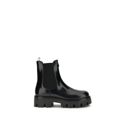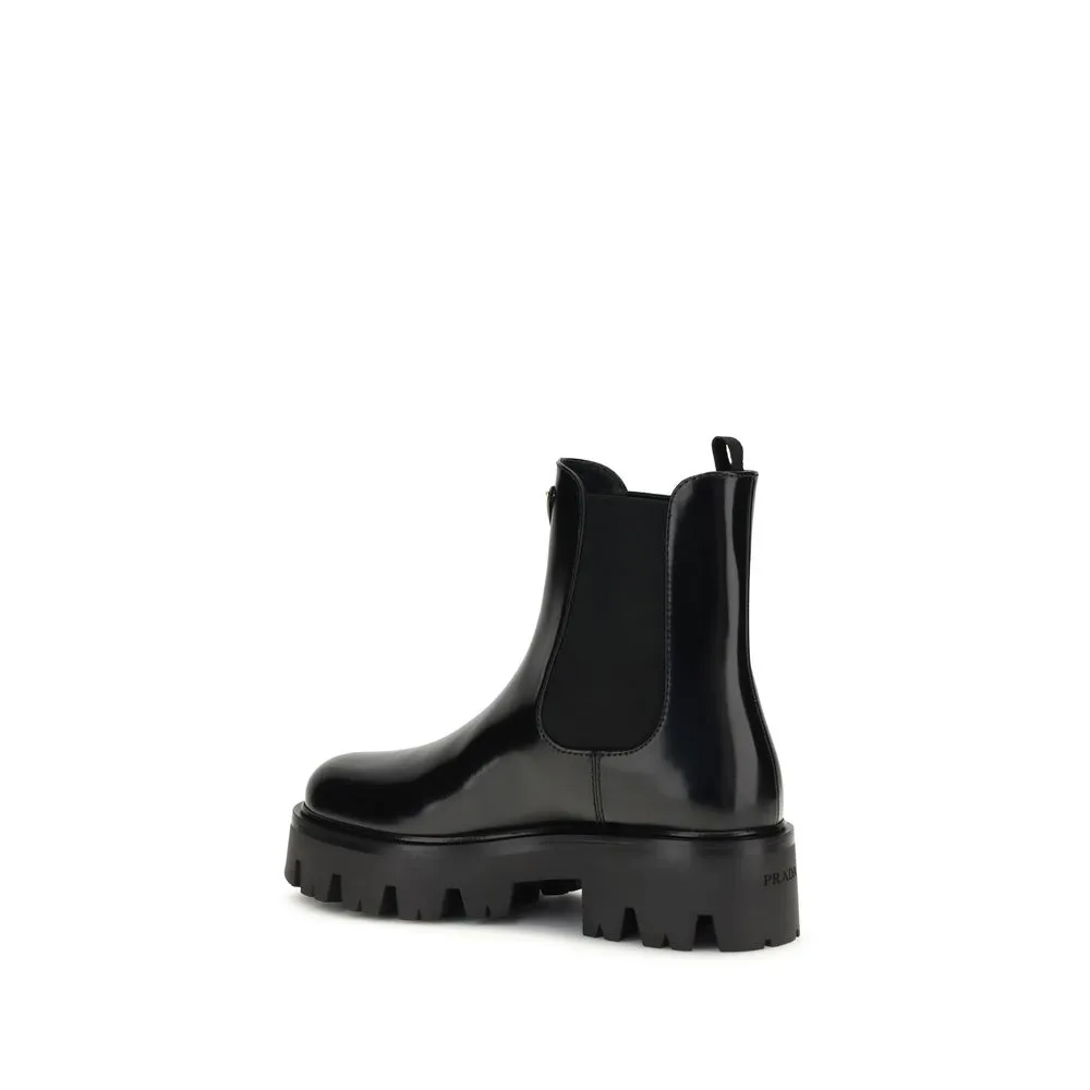 The brushed leather Ankle Boots by Prada combine sophistication with bold character. The upper features elasticated side inserts and a rear pull tab, while the leather lining ensures comfort and artisanal quality. The iconic enameled metal triangle logo enhances the design, completed by a lug sole with tread pattern and a chunky profile that adds structure and personality.
