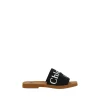Cotton Woody Sandals by Chloé, square toe, flat sole, branded insole, double front fabric band with iconic brand signature printed in contrast.