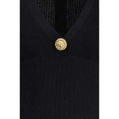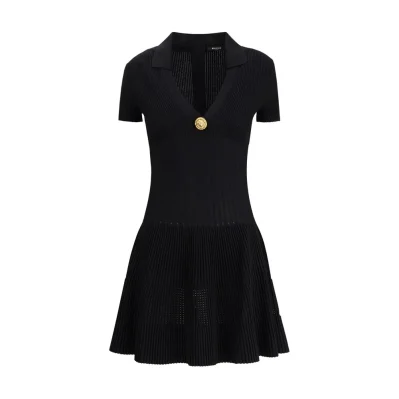 The flared knit mini Dress by Balmain showcases the Maison’s signature blend of structure and femininity. Crafted in a refined knit enhanced with tubular detailing, it features a V neckline embellished with the iconic Lion Head button, adding a touch of unmistakable Balmain heritage. The short sleeves and the wide waistband sculpt the silhouette, while the flared line lends movement and elegance. A visible back zip with a Balmain Paris–engraved puller completes the dress with a modern, luxurious accent.