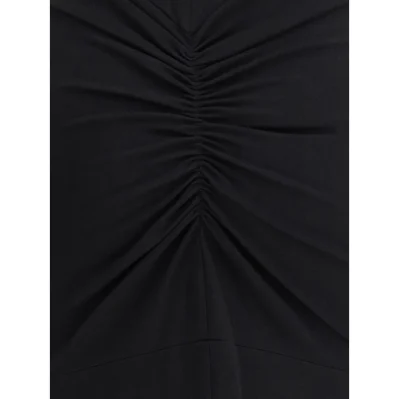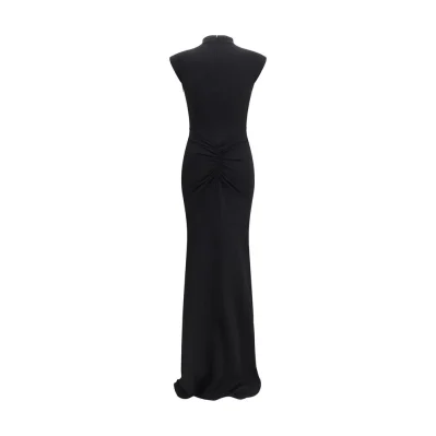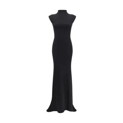 The Jacquemus fitted Dress in stretch crêpe features cap sleeves, a high neckline, and ruched detailing at the back. With an invisible zip closure and floor-length silhouette, it offers a slim and elegant fit, perfect for formal occasions