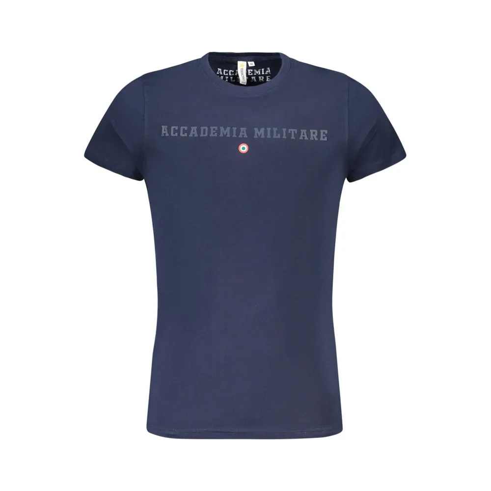 Elevate your wardrobe with a statement piece from ACCADEMIA MILITARE. This striking short sleeve T-shirt, with its bold contrast and signature logo, brings a touch of military prestige to your casual look. Crew neck and premium cotton blend for a comfortable fit. Made with integrity in Bangladesh. Show off your style command with this must-have blue tee.