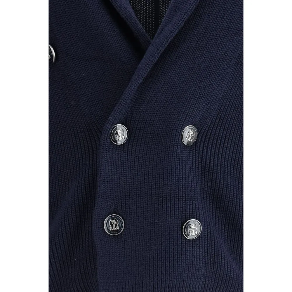 The Cardigan with button by Brunello Cucinelli fastening conveys refined elegance through its double-breasted design and shawl collar, elements that lend softness and presence to the silhouette. The branded buttons introduce a subtle distinctive touch, while the welt pockets complete the piece with discreet functionality. The clean construction and balanced proportions express Brunello Cucinelli’s understated and curated style, turning the Cardigan into a versatile garment with a naturally sophisticated and refined aesthetic.