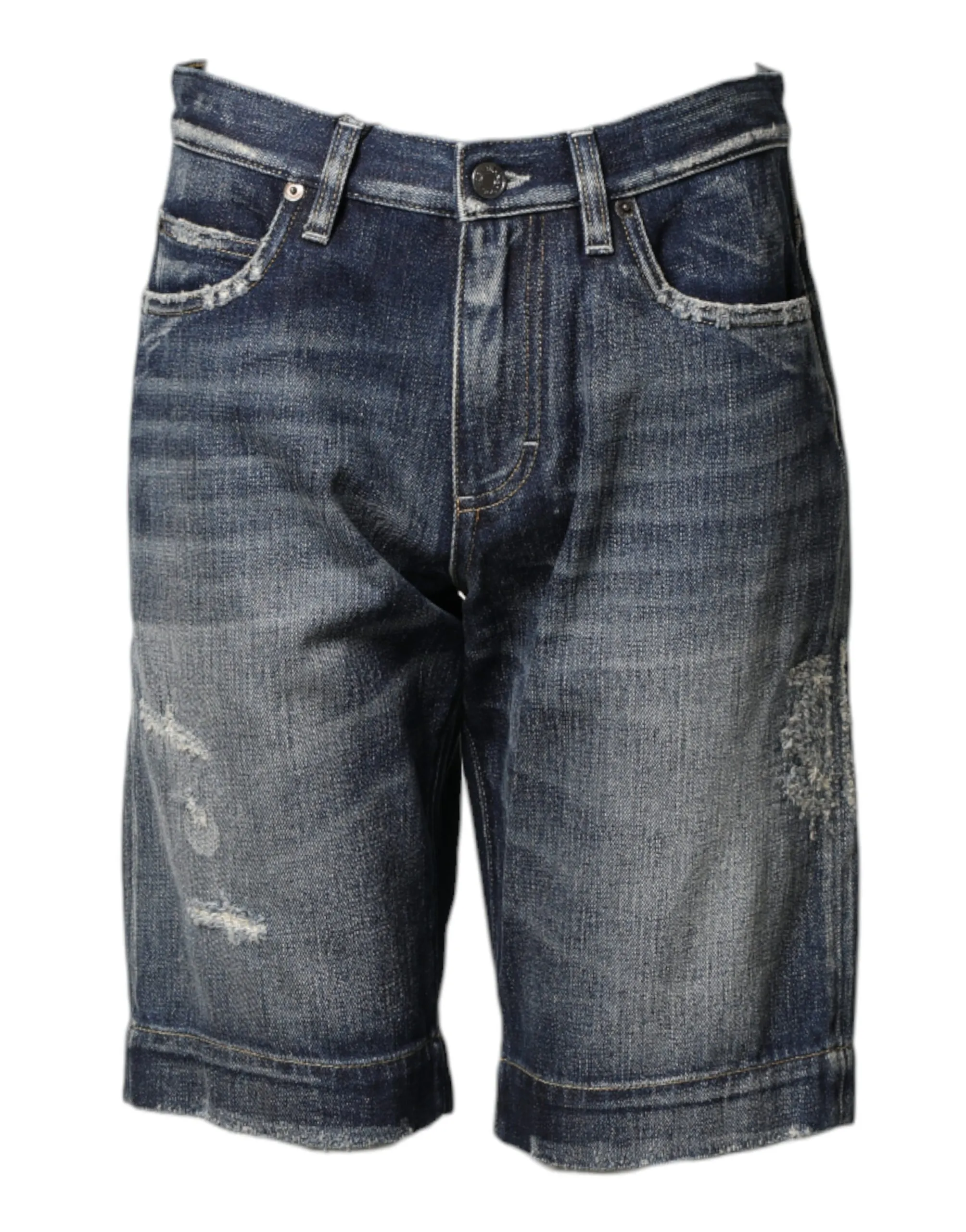 Bermuda shorts add a rugged, casual edge to warm-weather dressing. Crafted from blue cotton denim, they feature a relaxed Bermuda length and distressed detailing for a lived-in, contemporary look. Finished with classic five-pocket styling and subtle designer touches, they’re perfect for effortless off-duty outfits.