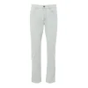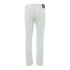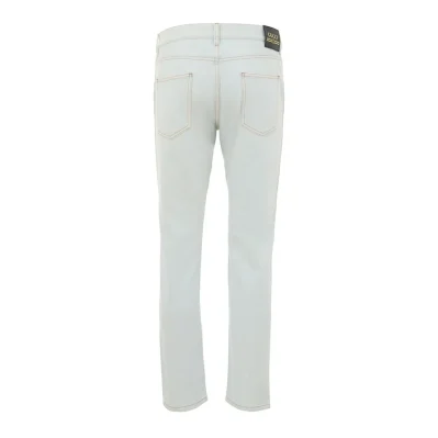 In light blue denim, no stretch, front opening with buttons, five pockets, on the back leather tag with gold contrasting logo.