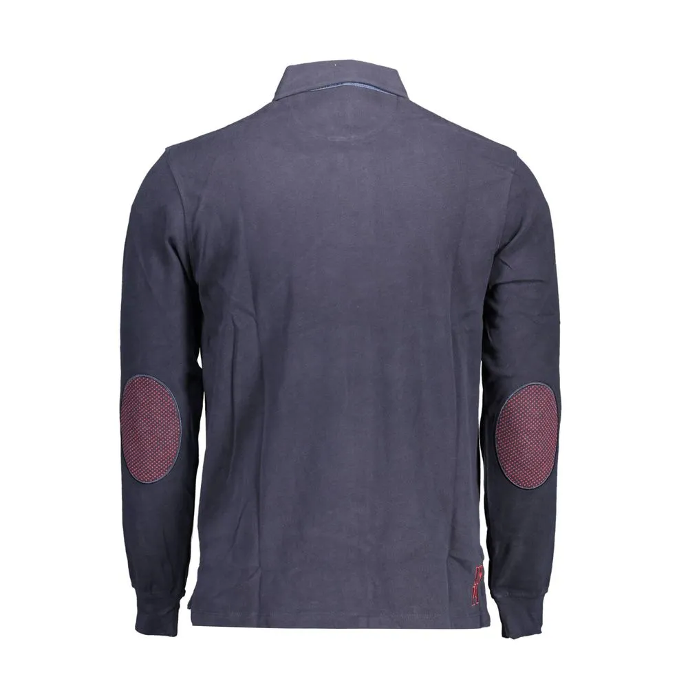 long-sleeved polo shirt, 3 buttons, embroidery, applications on the elbows, contrasting details, logo