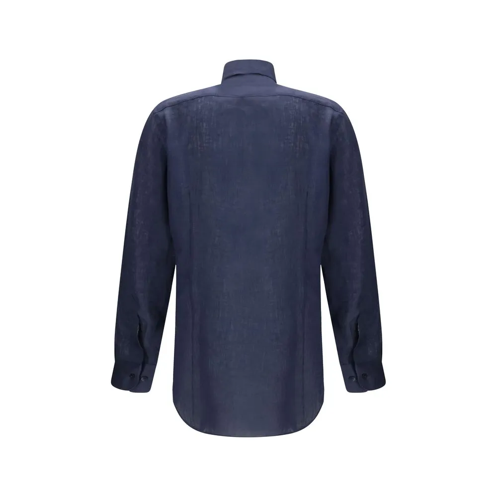 The linen Shirt by Etro is crafted from pure linen with a denim-effect finish and features a contrasting Pegaso embroidery on the chest. It includes a pointed collar, button fastening, and rounded button cuffs. The curved hem completes the design, offering a refined yet casual look.