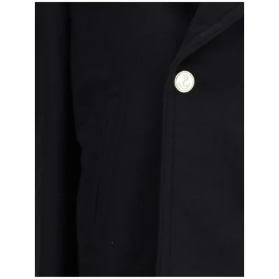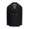 The Double-breasted Jacket by Thom Browne combines sartorial precision with the brand’s iconic detailing. Gold-tone buttons highlight the classic silhouette with notched lapels, while flap pockets and the signature grosgrain loop tab at the back provide distinctive refinement. A timeless piece that embodies the essence of contemporary tailoring.