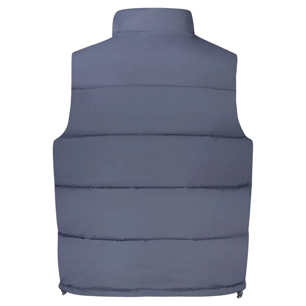 Elevate your wardrobe with the effortlessly chic Guess Jeans Sleeveless Jacket. Crafted for the modern trendsetter, this piece exudes confidence with its thermal padding and an array of pockets—2 external, 4 internal—ensuring functionality without sacrificing style. The fusion of buttons and zip detailing complement the standout blue hue and bold Guess logo, making it a statement garment for any occasion.