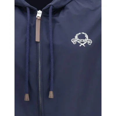 Moschino’s Waterproof Jacket combines functionality and urban style. Featuring a hood and front zipper closure, it has an elasticized hem and cuffs for optimal protection. The two side welt pockets add practicality, while the stitched logo on the front signs the garment with a distinctive touch.