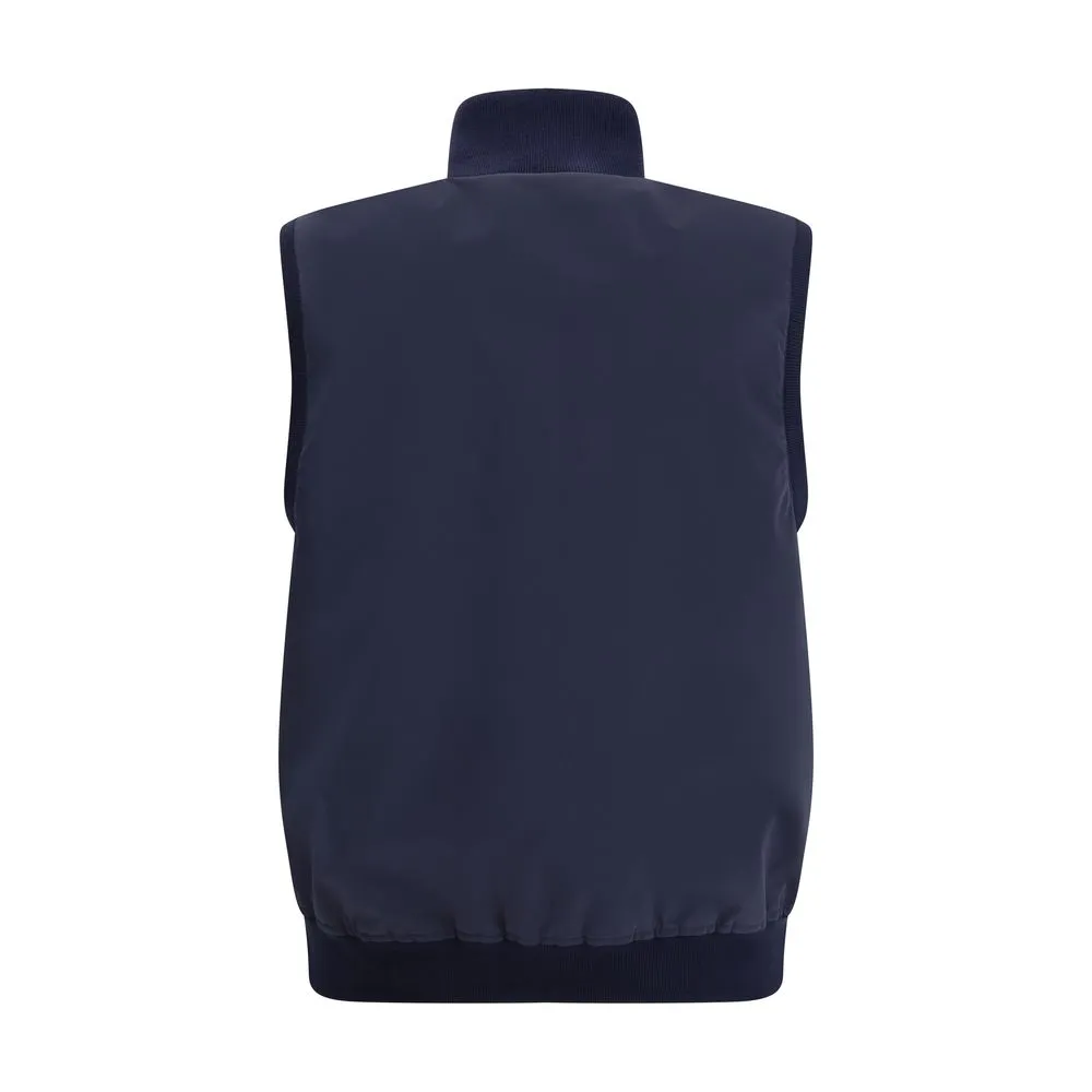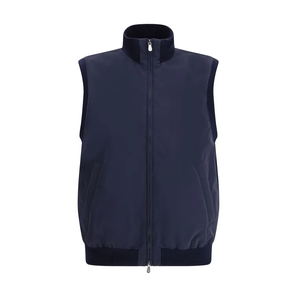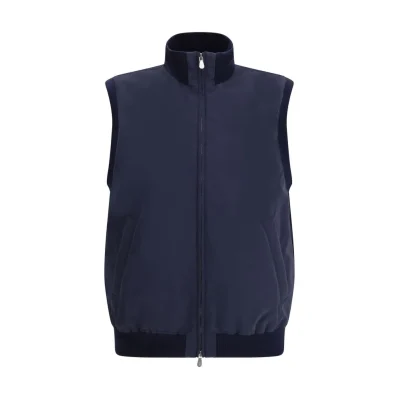 The sleeveless Vest Jacket by Brunello Cucinelli is an elegant and functional piece featuring a two-way front zipper and welt pockets on both sides of the front. The hem is finished with an elastic band for a comfortable fit, while the armhole edges are crafted in ribbed fabric. The slightly raised ribbed collar adds structure and a refined touch to the design.