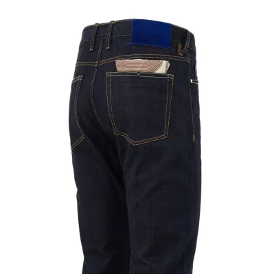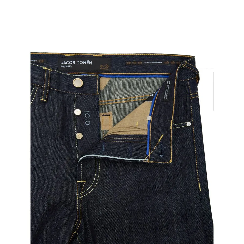 Tailoring line. Made from dark blue non-stretch cotton, five pockets, concealed button and button fastening, tapered fit with a straight leg and low crotch. Electric blue pony hair tag on the back with a micro logo trim and contrasting stitching. Sold with a cotton bandana and scented with the exclusive Jacob Cohen fragrance. Composition: 65% Polyester, 35% Cotton
