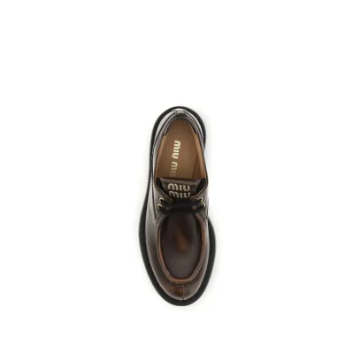 The Laced Shoes by Miu Miu feature a lace-up closure and logo on the tongue. The leather features a smoky finish that gives it a vintage effect