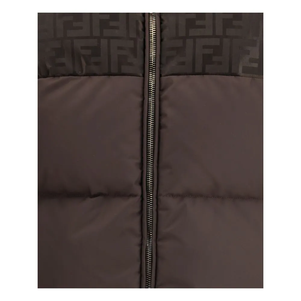 The Cotton-blend Down Jacket by Fendi features a balanced structure combining nylon inserts with a tonal FF embroidery on the front and back. The hood with drawstring, zip fastening, and slit pockets emphasize the garment’s practicality, completed by ribbed cuffs and an internal drawstring at the hem for an adjustable fit. Fully lined, it blends functionality and refinement in an urban style that reflects the Maison’s contemporary elegance.