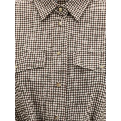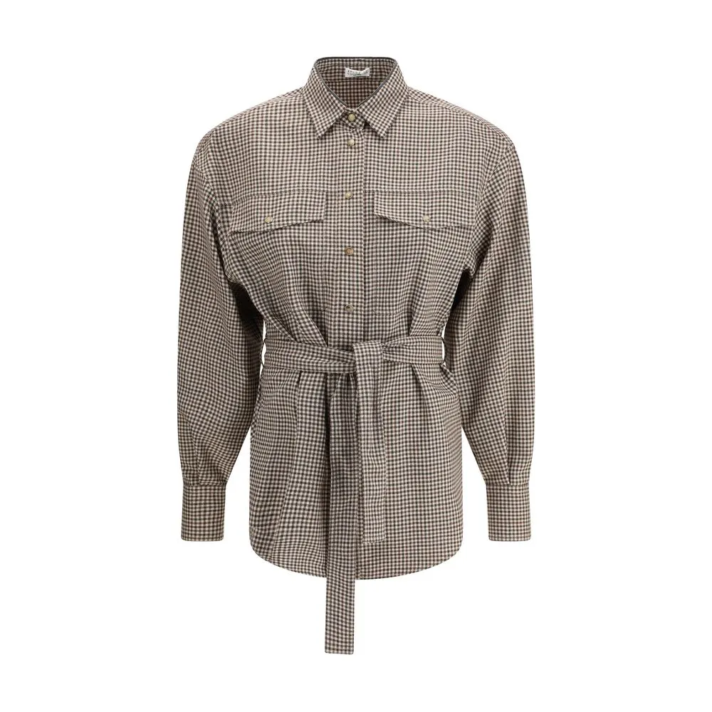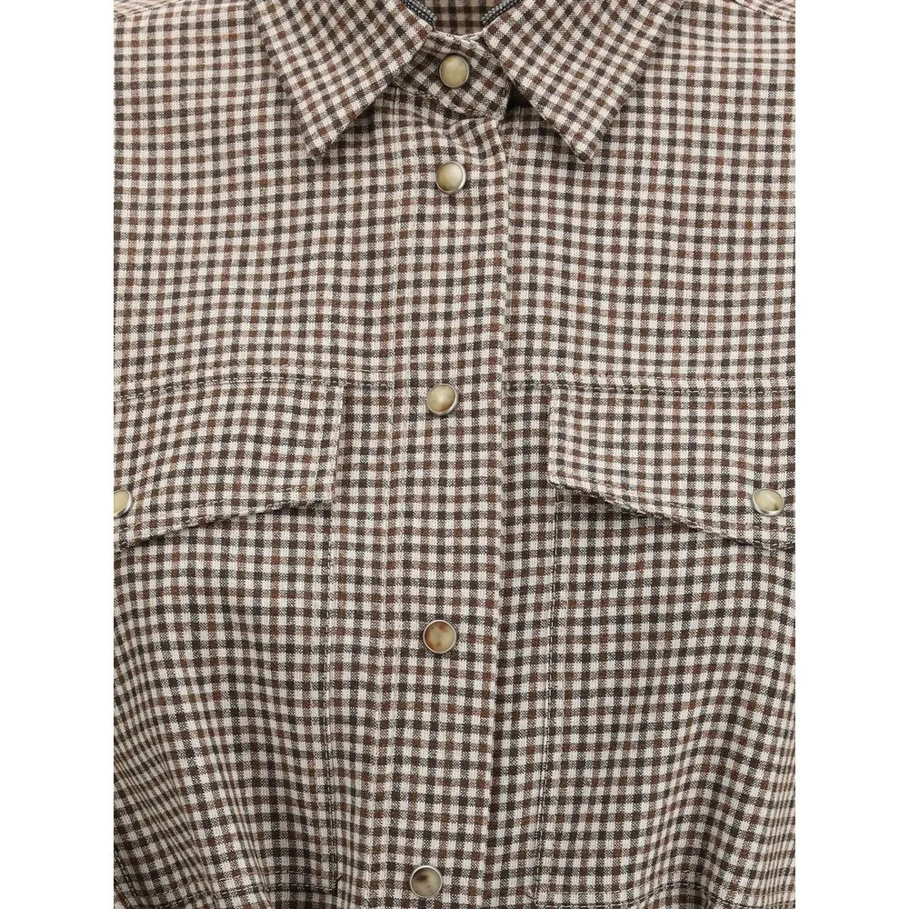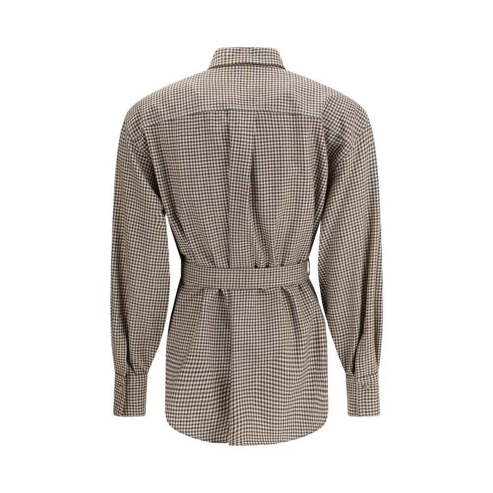 The checked virgin wool Shirt by Brunello Cucinelli embodies a refined balance of tradition and modern femininity. The country-inspired check pattern evokes a timeless charm, while the soft fit with voluminous sleeves and dropped shoulders lends an elegant reinterpretation of classic menswear. The removable belt gently defines the waist, and the monile embroidery on the collar adds a delicate sparkle — a signature element that enhances the shirt with the distinctive elegance of the Brunello Cucinelli aesthetic.